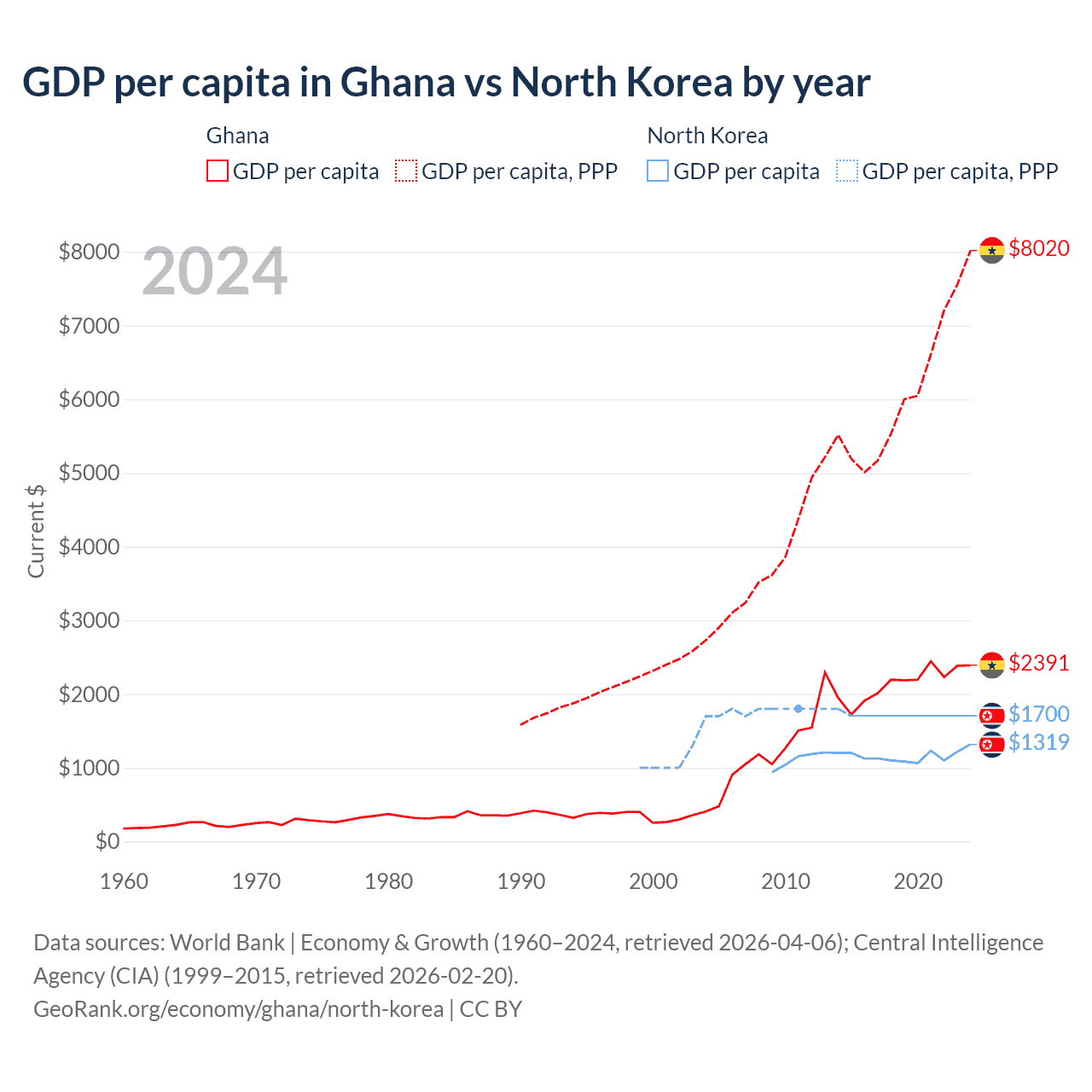 GDP per capita in Ghana vs North Korea by year