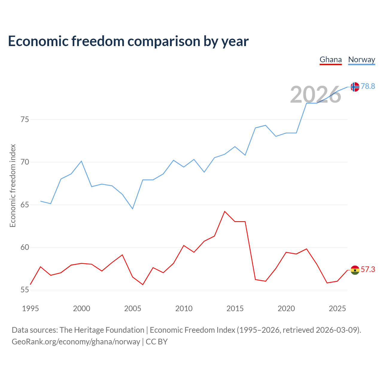The Economic Freedom Index for Ghana is 57.3, ranking 118/197, compared to 78.8 for Norway, ranking 9/197. The chart above displays a comparison of annual changes in economic freedom indexes.