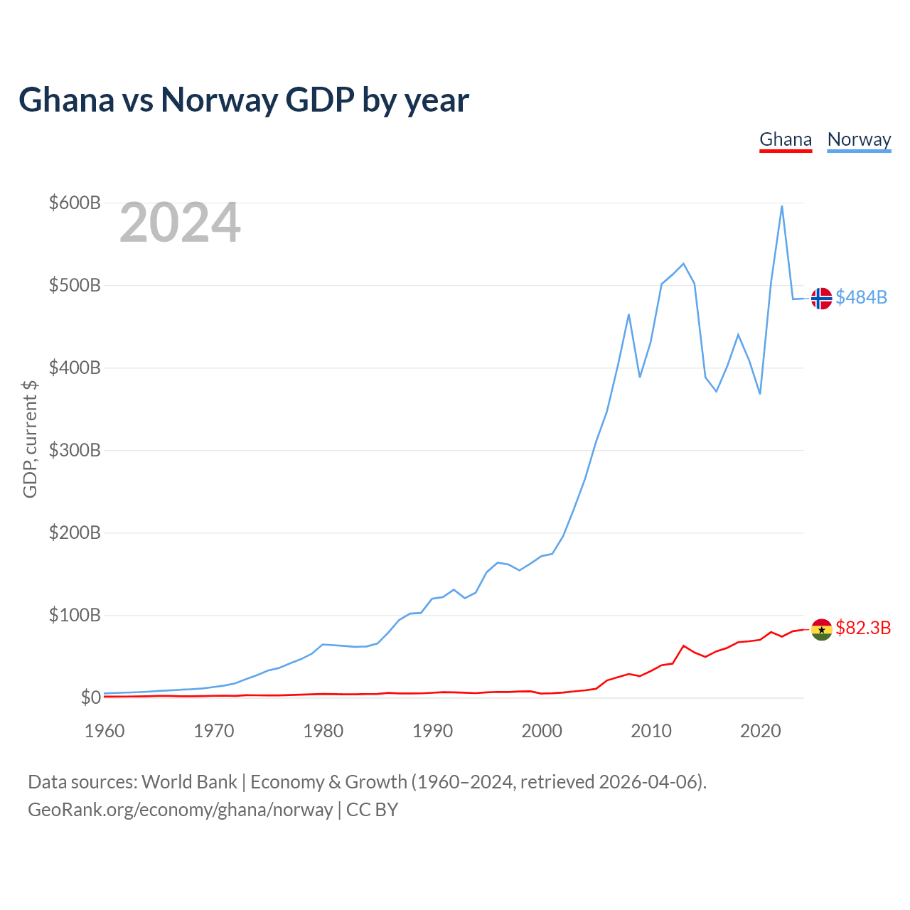 Ghana has a GDP of $82.3B compared to $484B for Norway, ranking 80/197 and 32/197 by economy size, respectively.