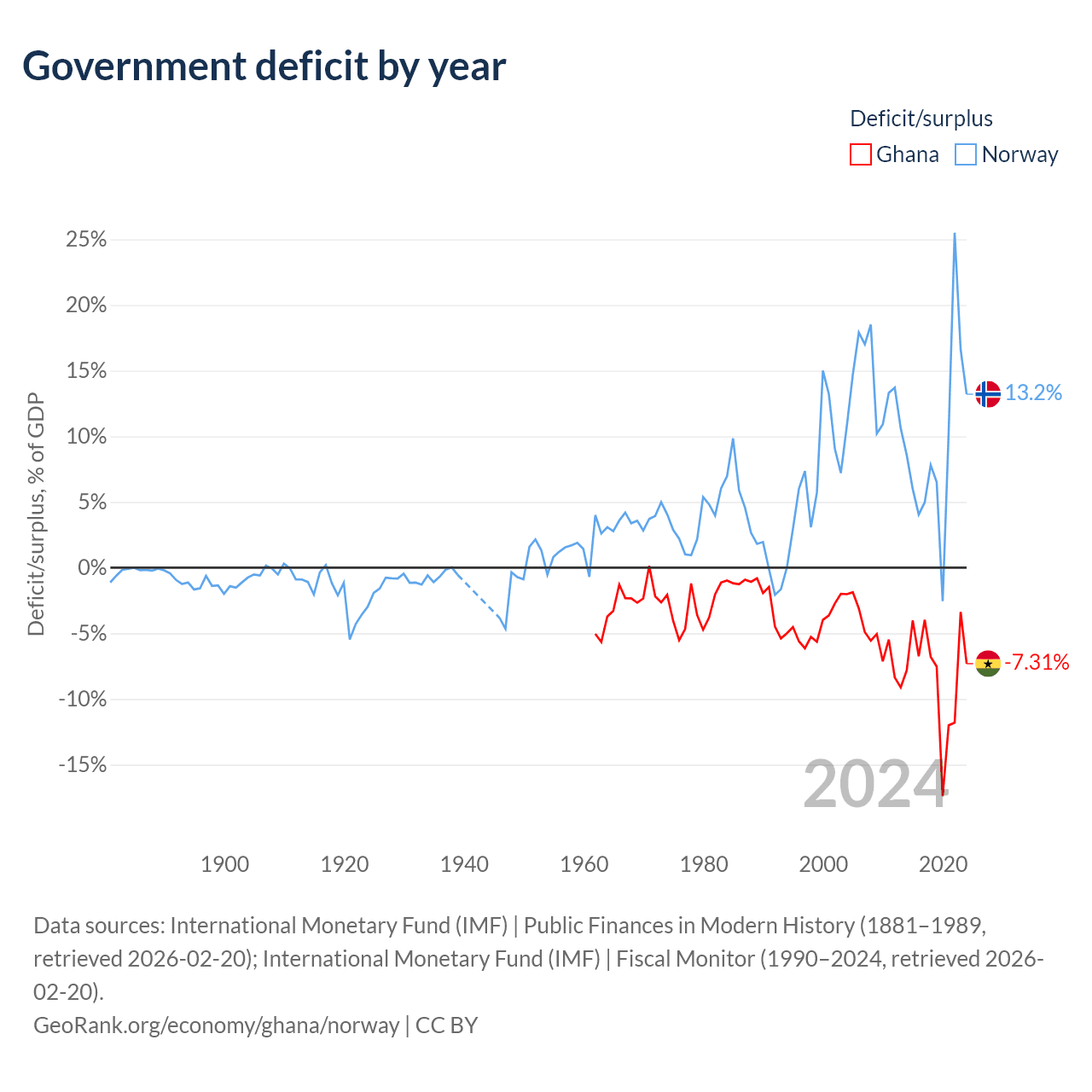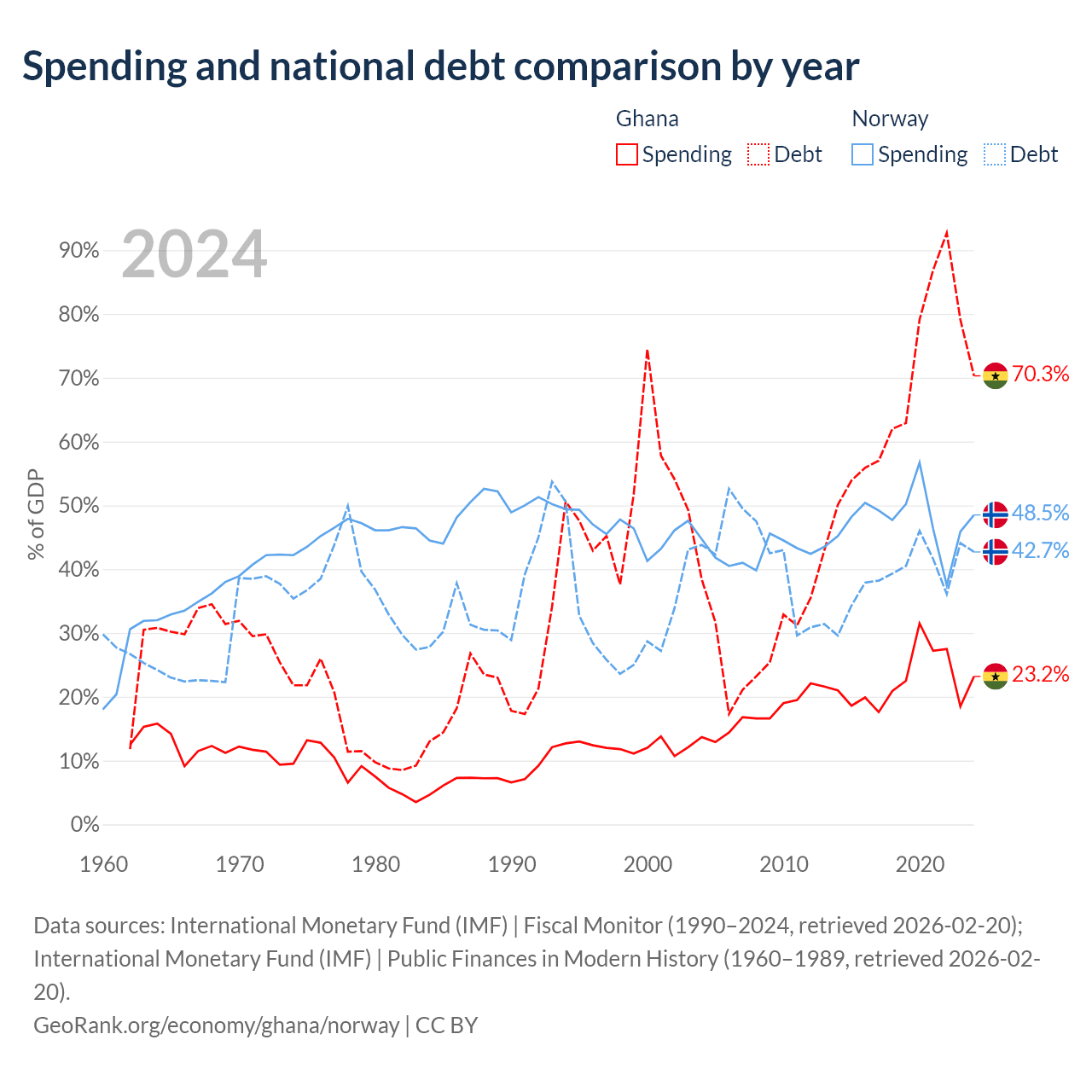Ghana has $57.9B in government debt (70.3% of GDP), compared to $207B (42.7% of GDP) in Norway.