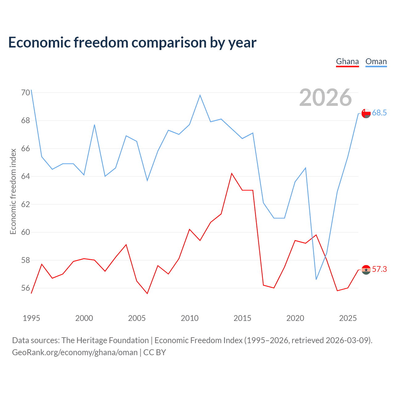 The Economic Freedom Index for Ghana is 57.3, ranking 118/197, compared to 68.5 for Oman, ranking 45/197. The chart above displays a comparison of annual changes in economic freedom indexes.