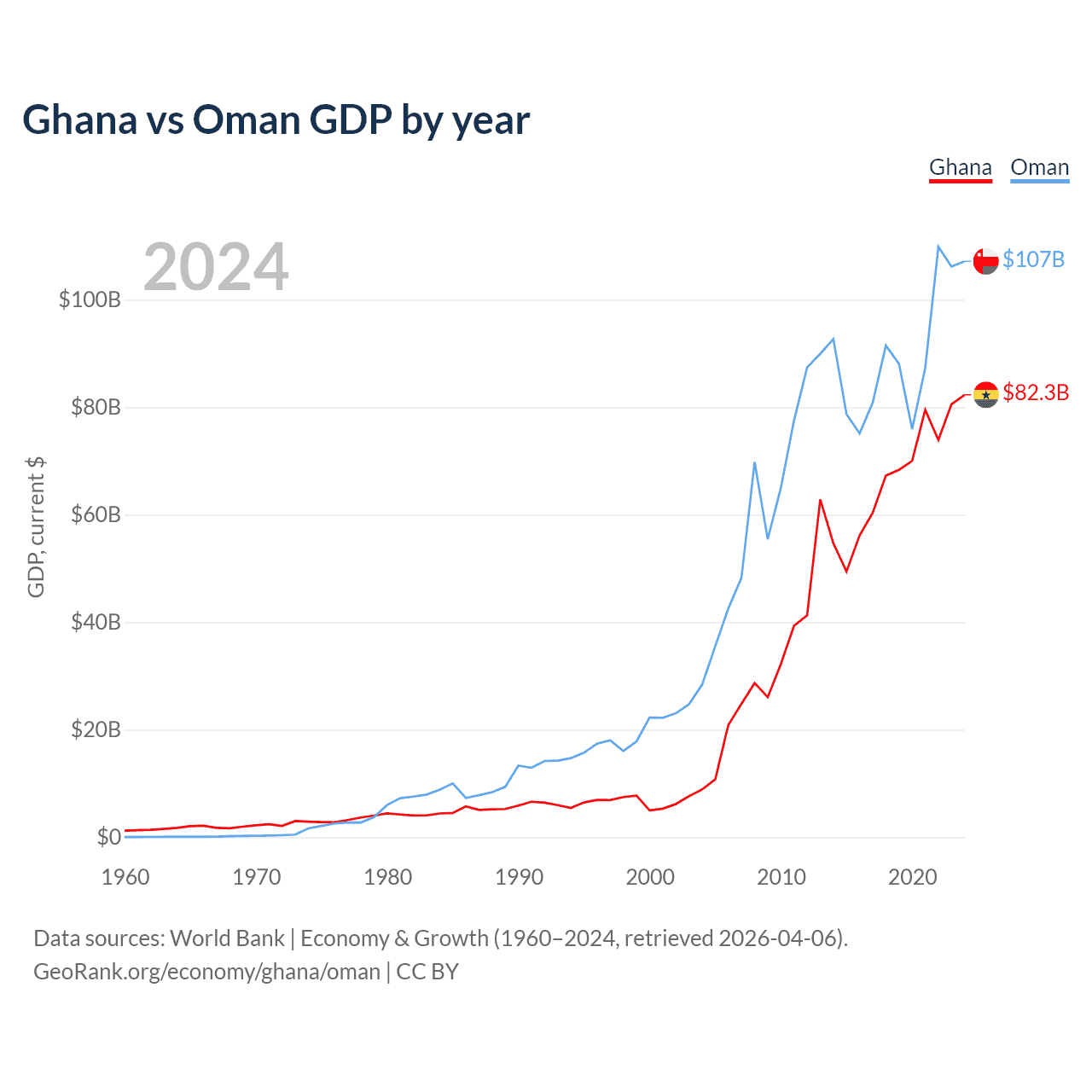 Ghana has a GDP of $82.3B compared to $107B for Oman, ranking 80/197 and 70/197 by economy size, respectively.