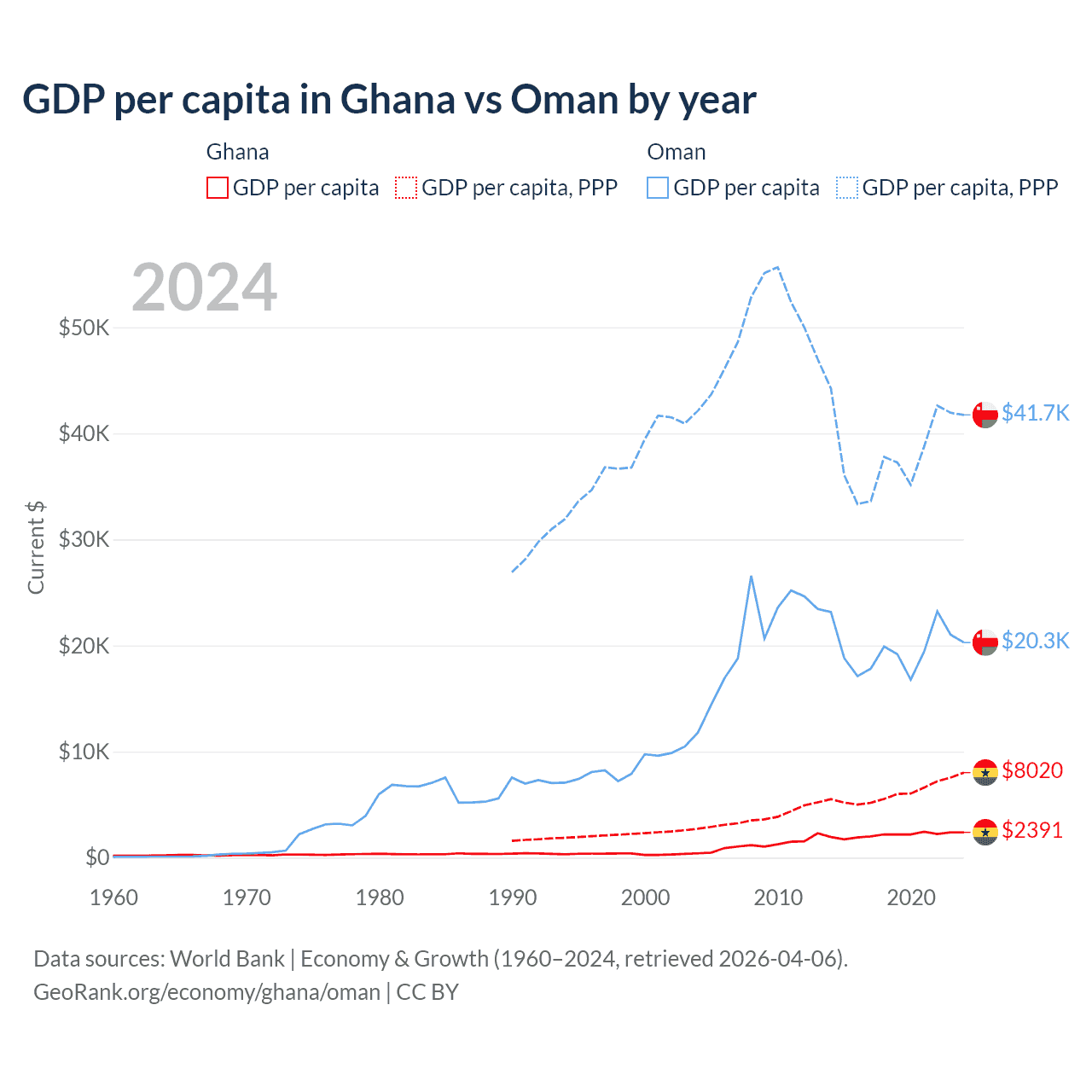 GDP per capita in Ghana vs Oman by year