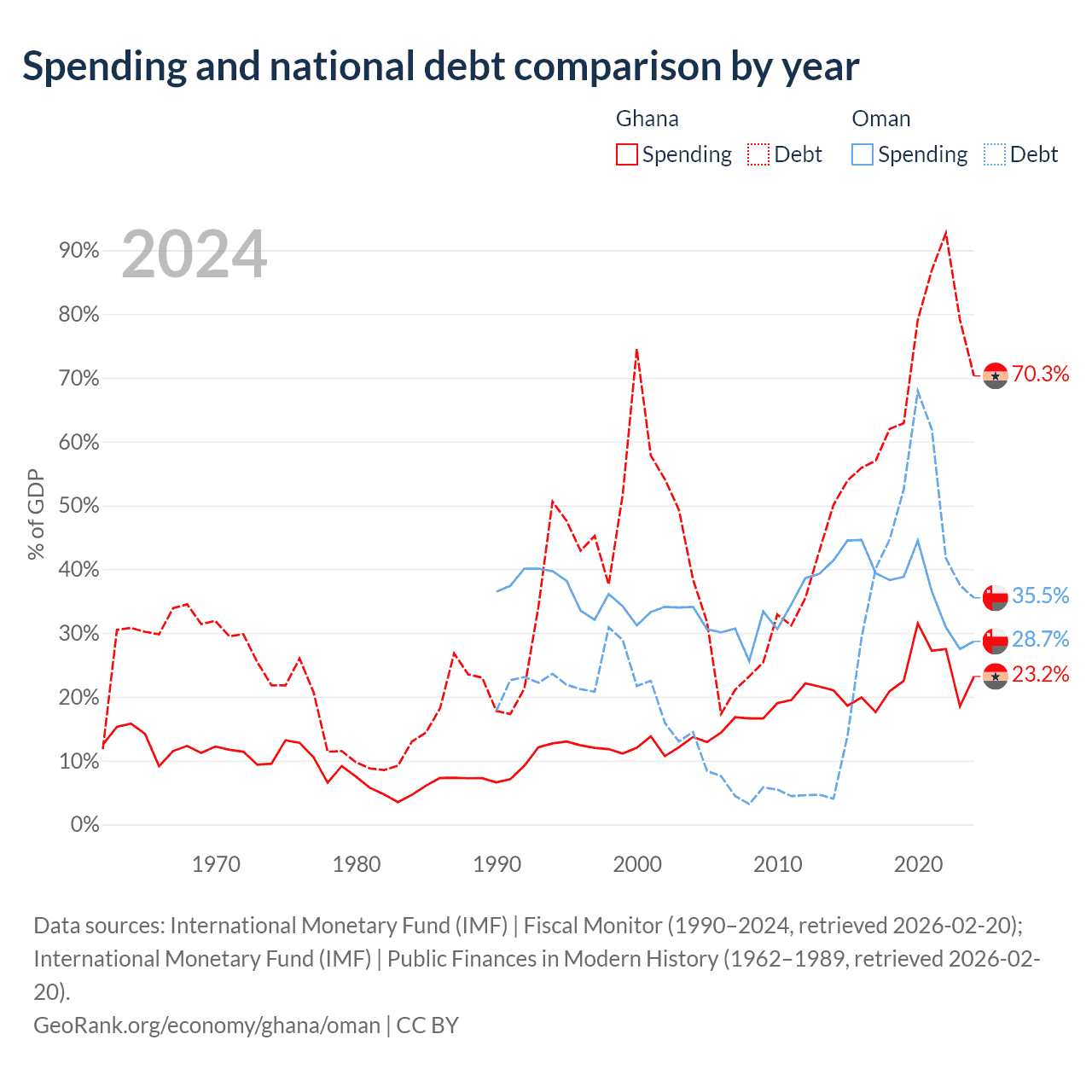 Ghana has $57.9B in government debt (70.3% of GDP), compared to $38B (35.5% of GDP) in Oman.