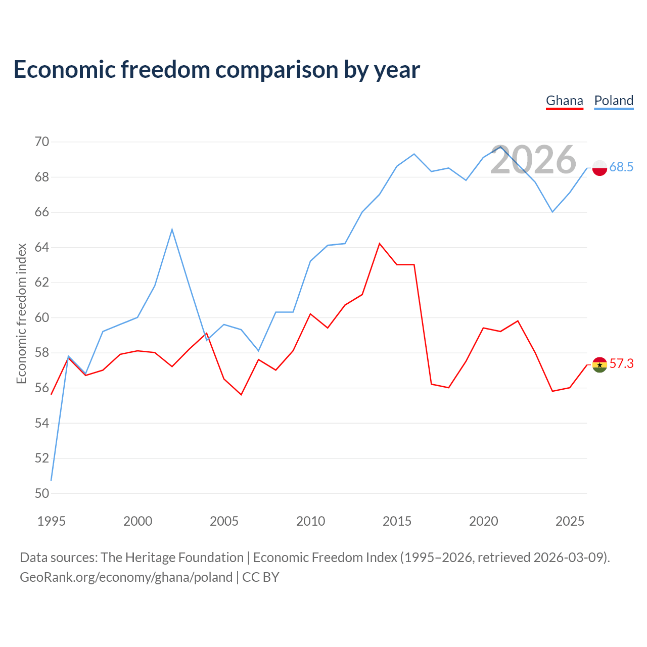 The Economic Freedom Index for Ghana is 57.3, ranking 118/197, compared to 68.5 for Poland, ranking 46/197. The chart above displays a comparison of annual changes in economic freedom indexes.