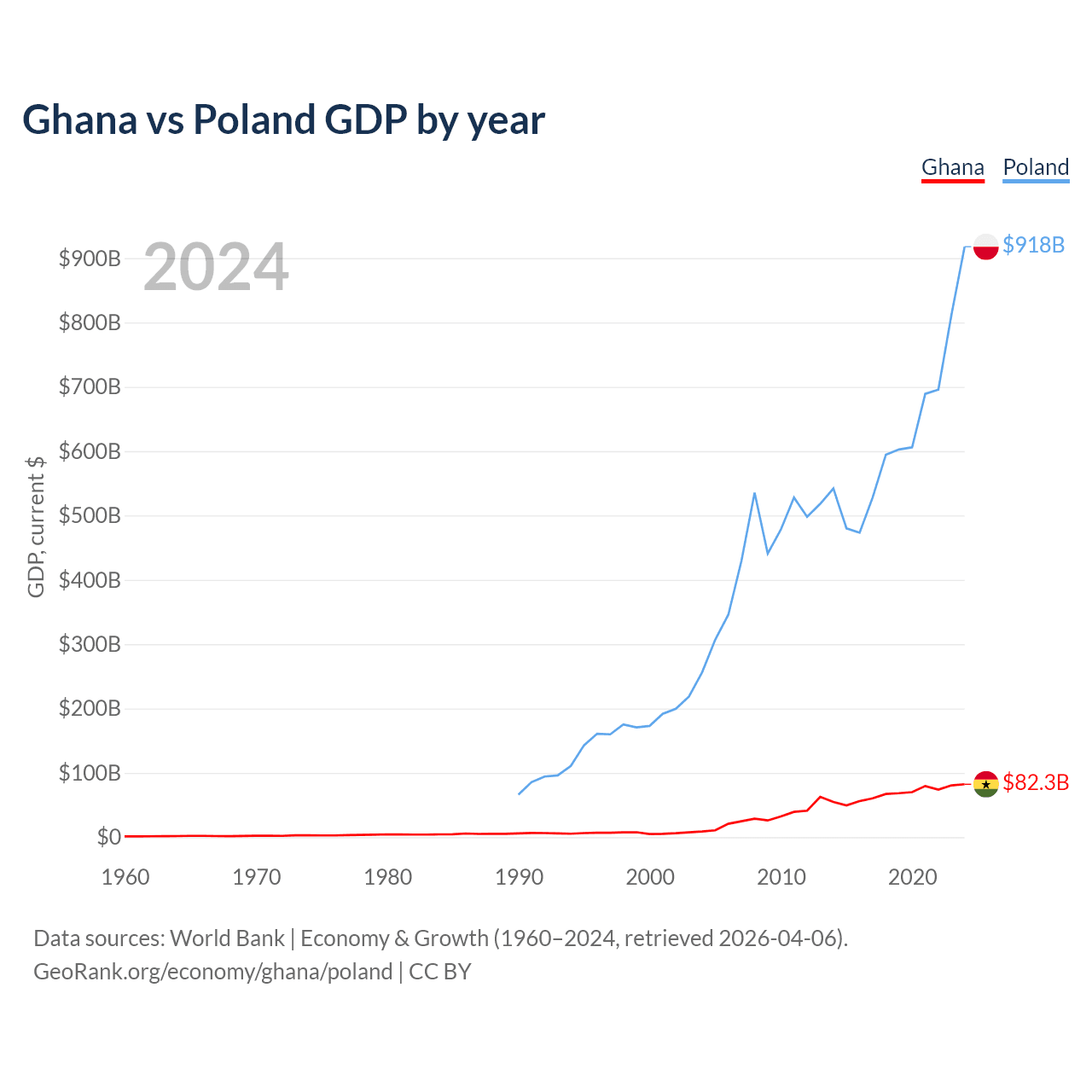 Ghana has a GDP of $82.3B compared to $918B for Poland, ranking 80/197 and 21/197 by economy size, respectively.