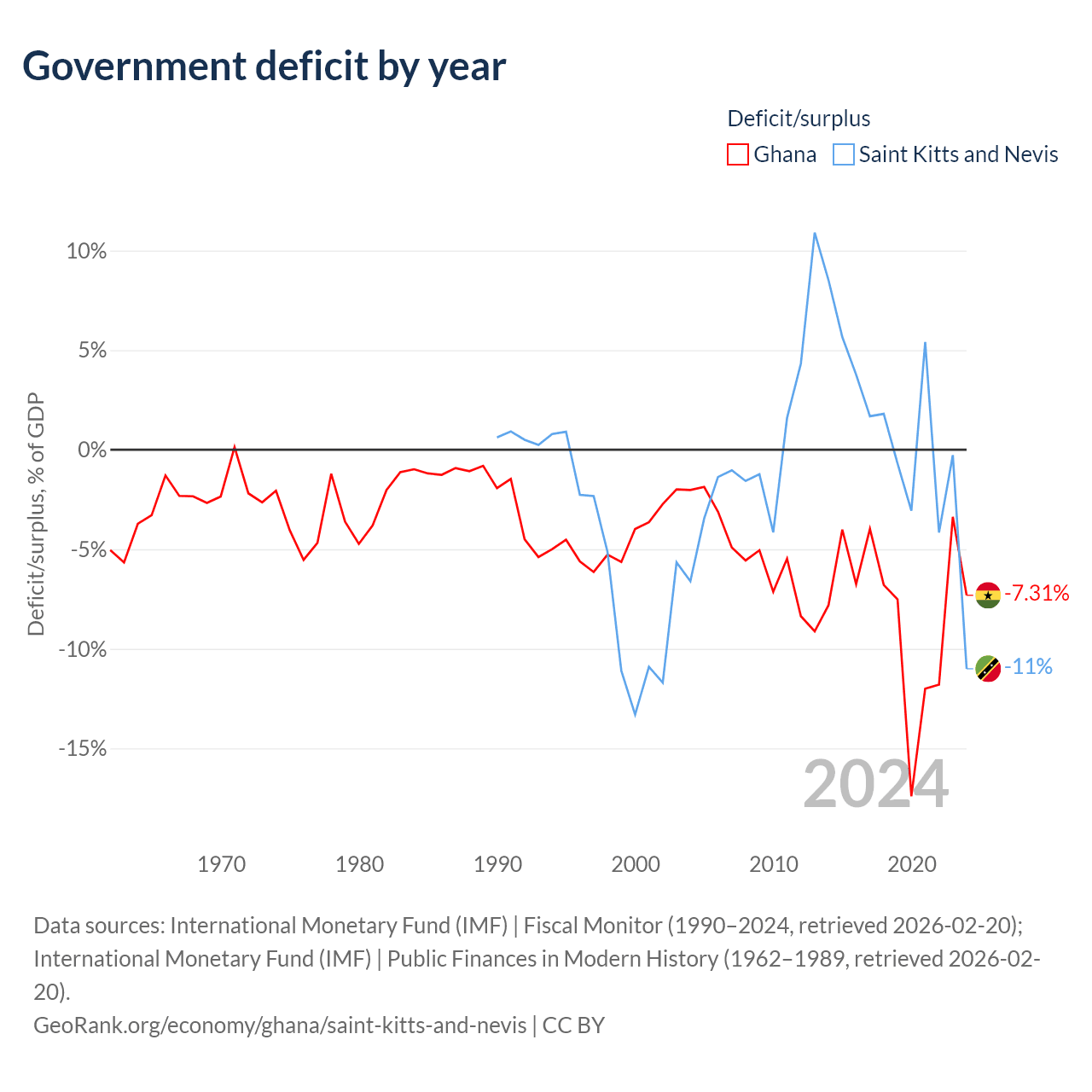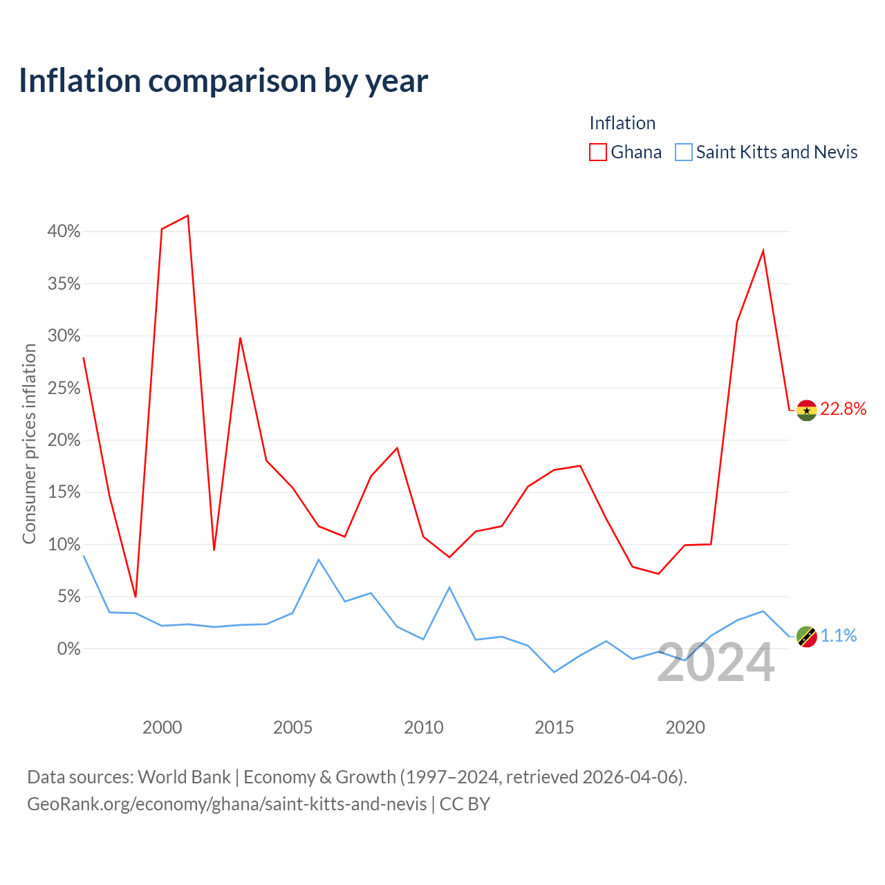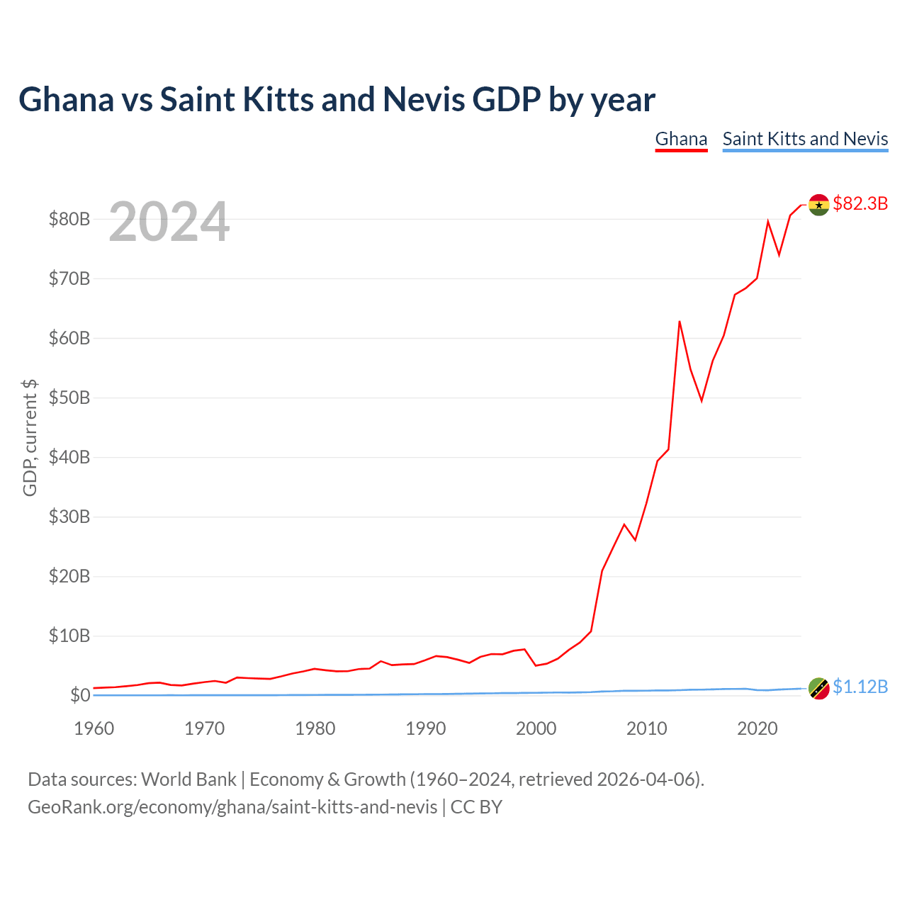 Ghana has a GDP of $82.3B compared to $1.12B for Saint Kitts and Nevis, ranking 80/197 and 187/197 by economy size, respectively.