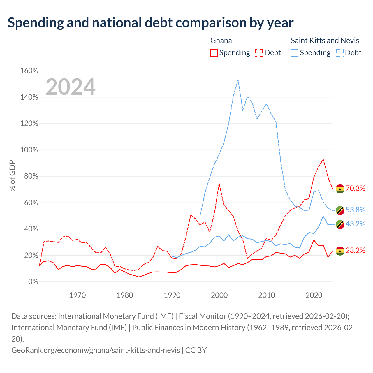 Ghana has $57.9B in government debt (70.3% of GDP), compared to $604M (53.8% of GDP) in Saint Kitts and Nevis.