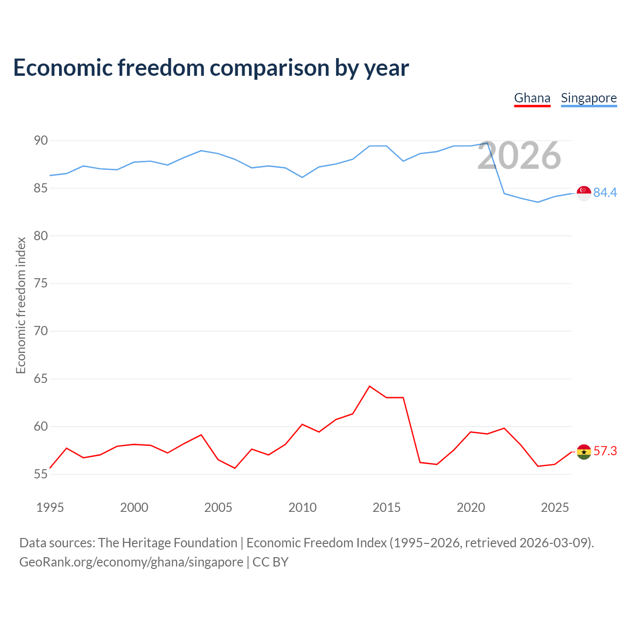 The Economic Freedom Index for Ghana is 57.3, ranking 118/197, compared to 84.4 for Singapore, ranking 1/197. The chart above displays a comparison of annual changes in economic freedom indexes.