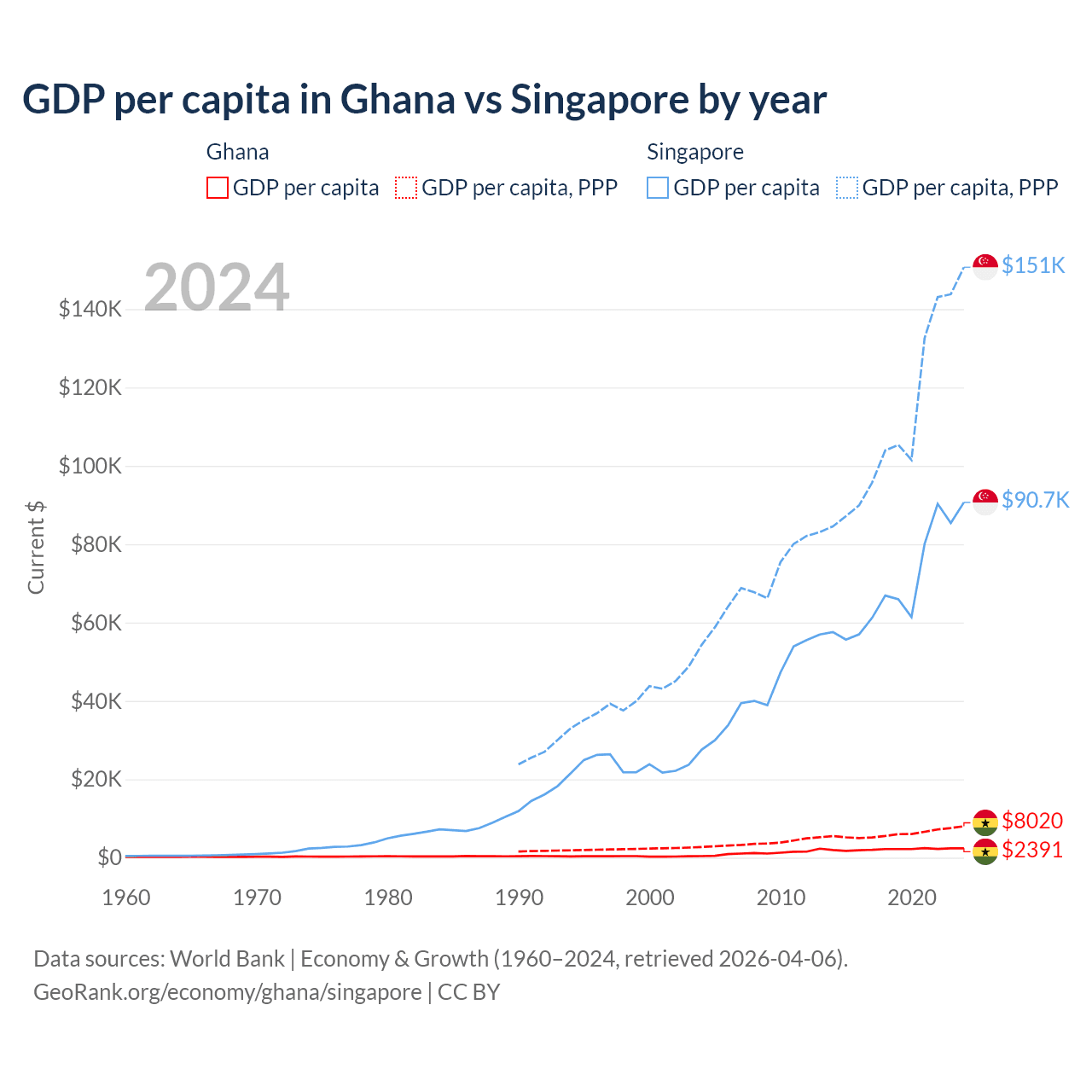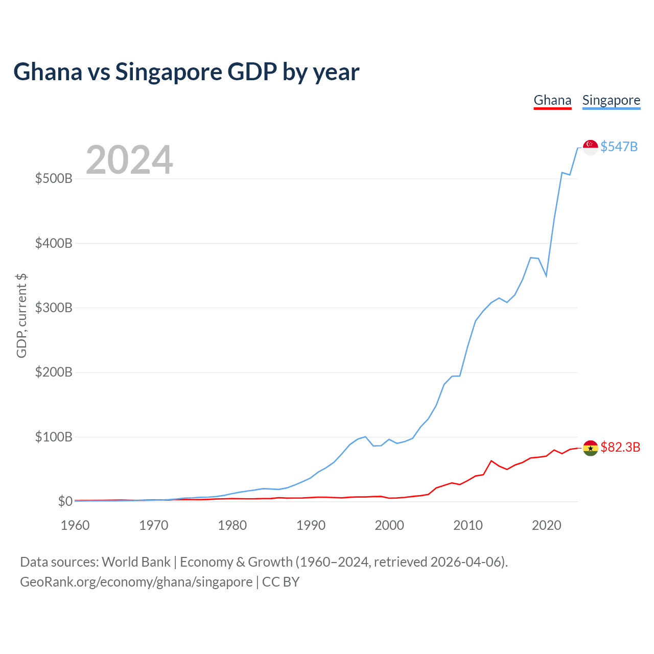 Ghana has a GDP of $82.3B compared to $547B for Singapore, ranking 80/197 and 28/197 by economy size, respectively.