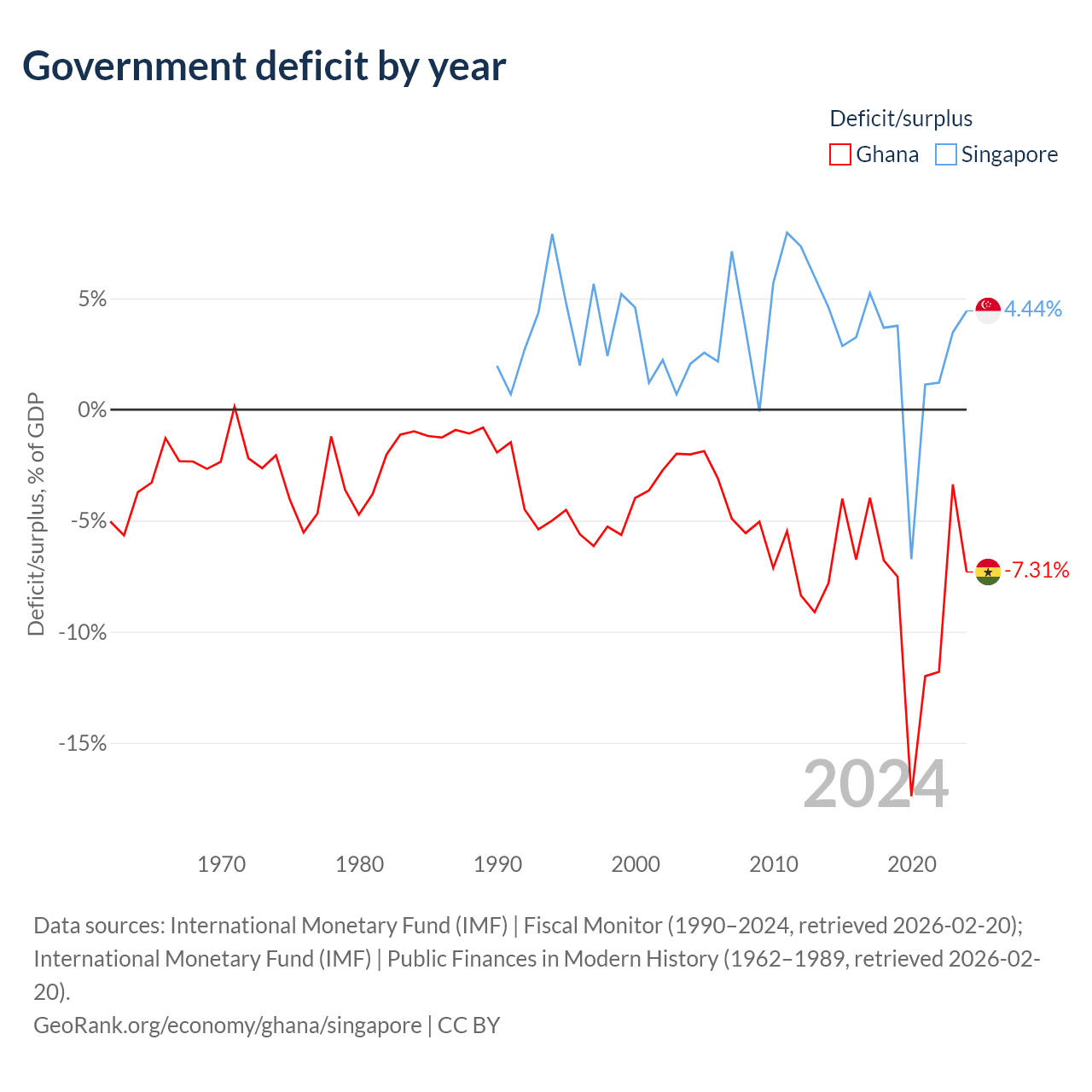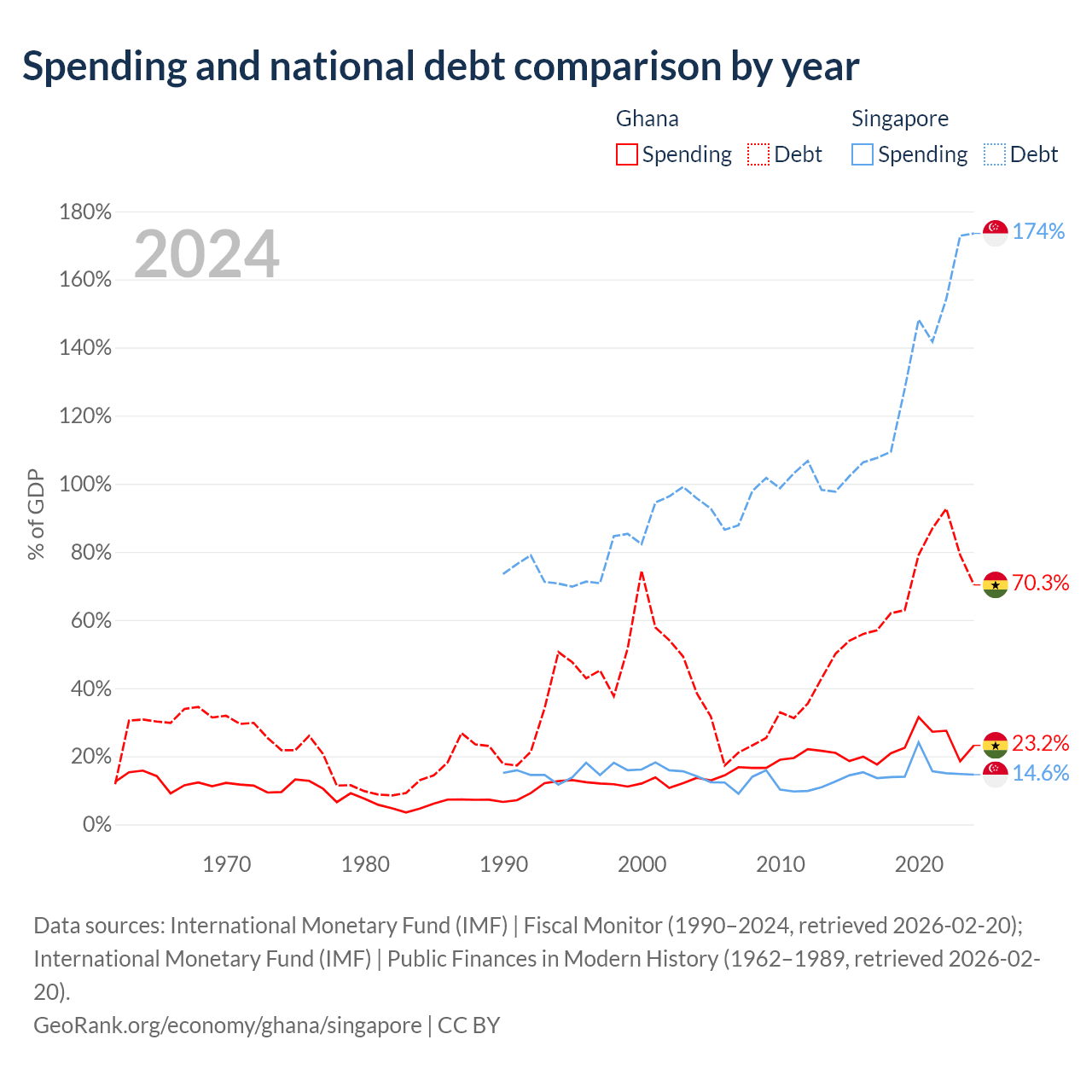 Ghana has $57.9B in government debt (70.3% of GDP), compared to $950B (173.5% of GDP) in Singapore.