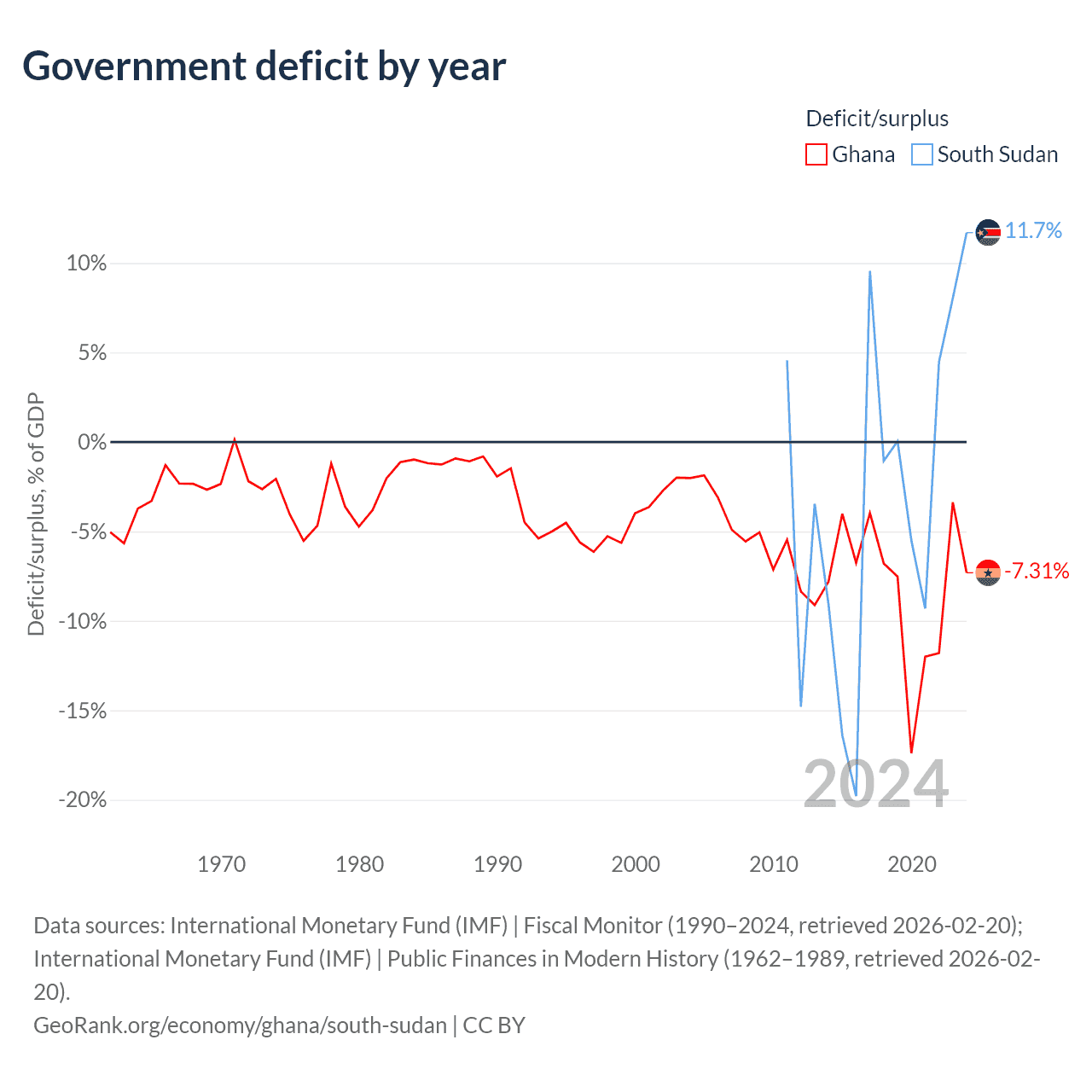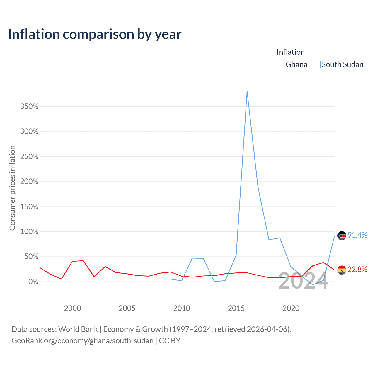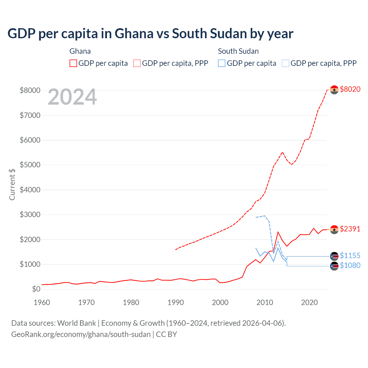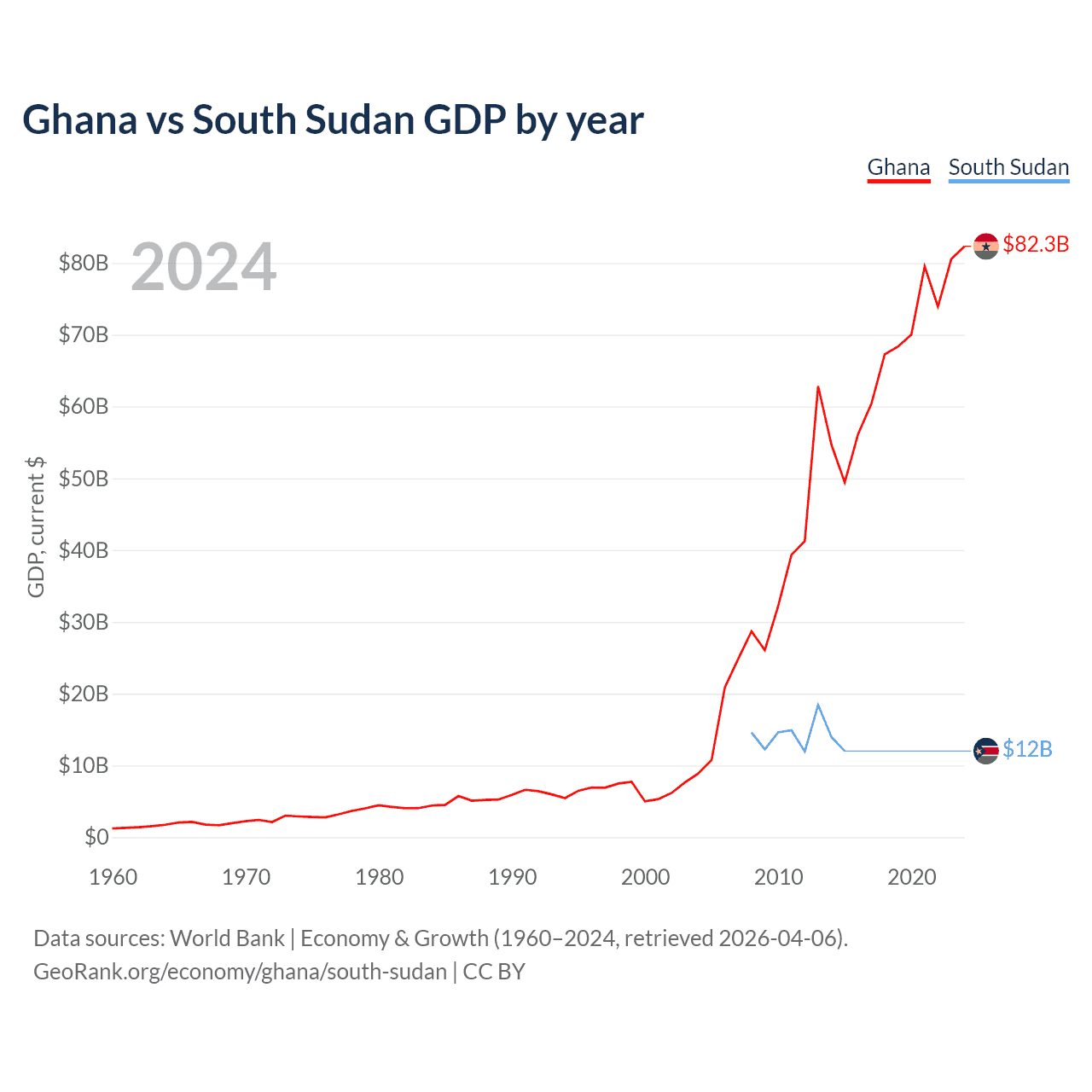 Ghana has a GDP of $82.3B compared to $12B for South Sudan, ranking 80/197 and 149/197 by economy size, respectively.