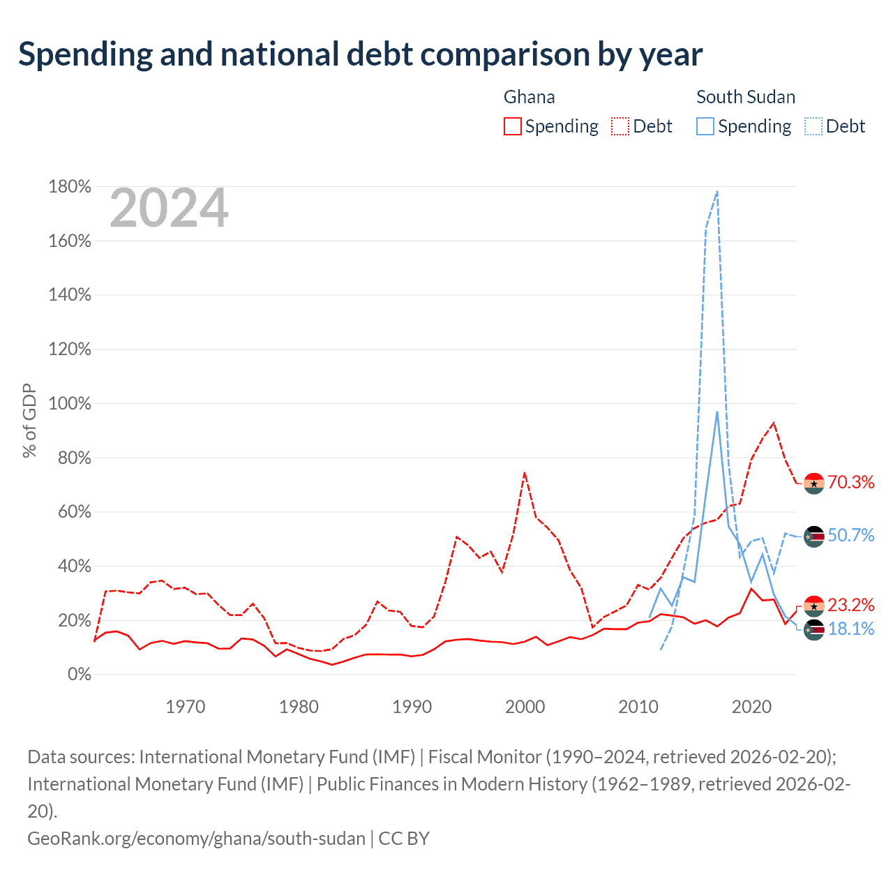 Ghana has $57.9B in government debt (70.3% of GDP), compared to $7.04B (50.7% of GDP) in South Sudan.