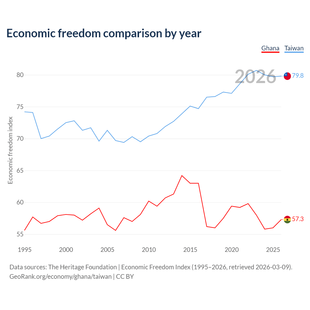 The Economic Freedom Index for Ghana is 57.3, ranking 118/197, compared to 79.8 for Taiwan, ranking 6/197. The chart above displays a comparison of annual changes in economic freedom indexes.