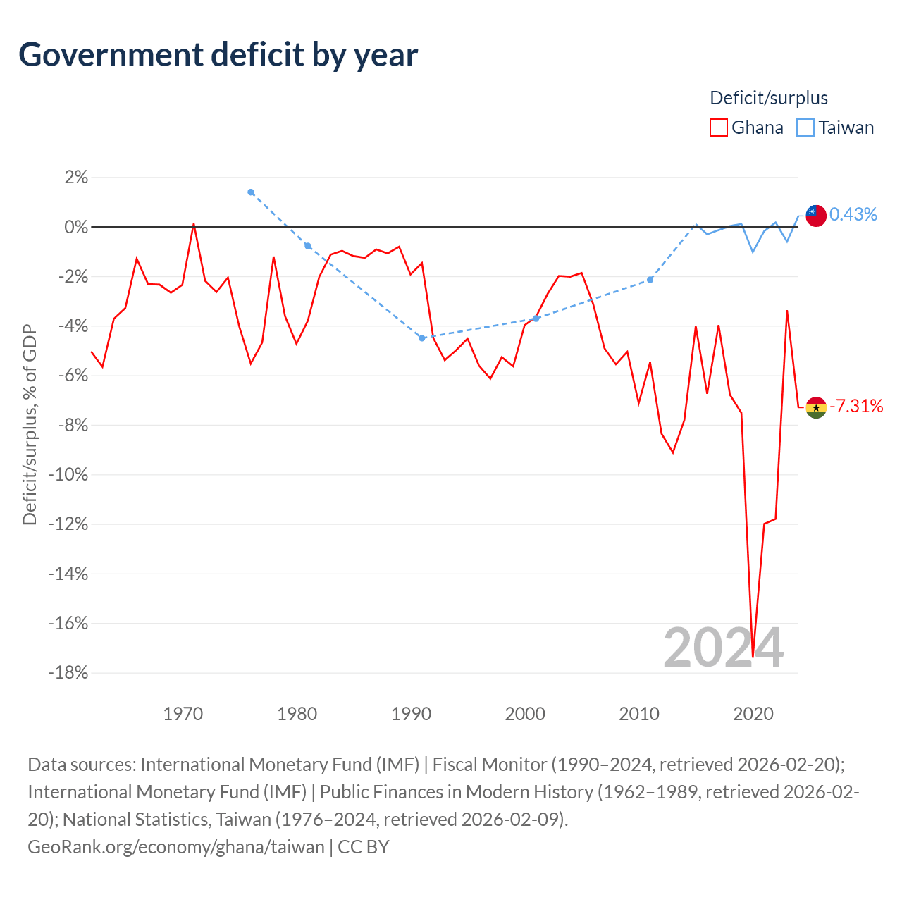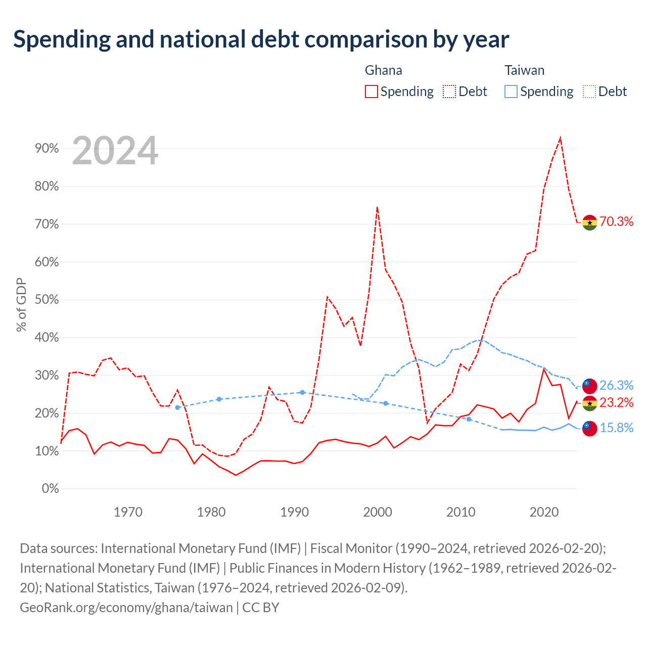 Ghana has $57.9B in government debt (70.3% of GDP), compared to $211B (26.3% of GDP) in Taiwan.