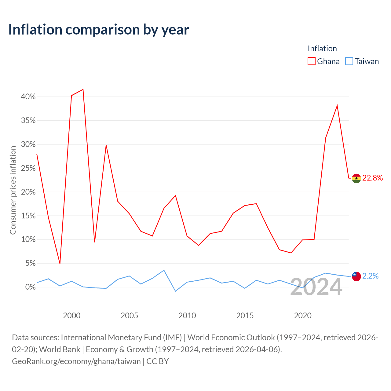 Ghana has a GDP of $82.3B compared to $802B for Taiwan, ranking 80/197 and 22/197 by economy size, respectively.