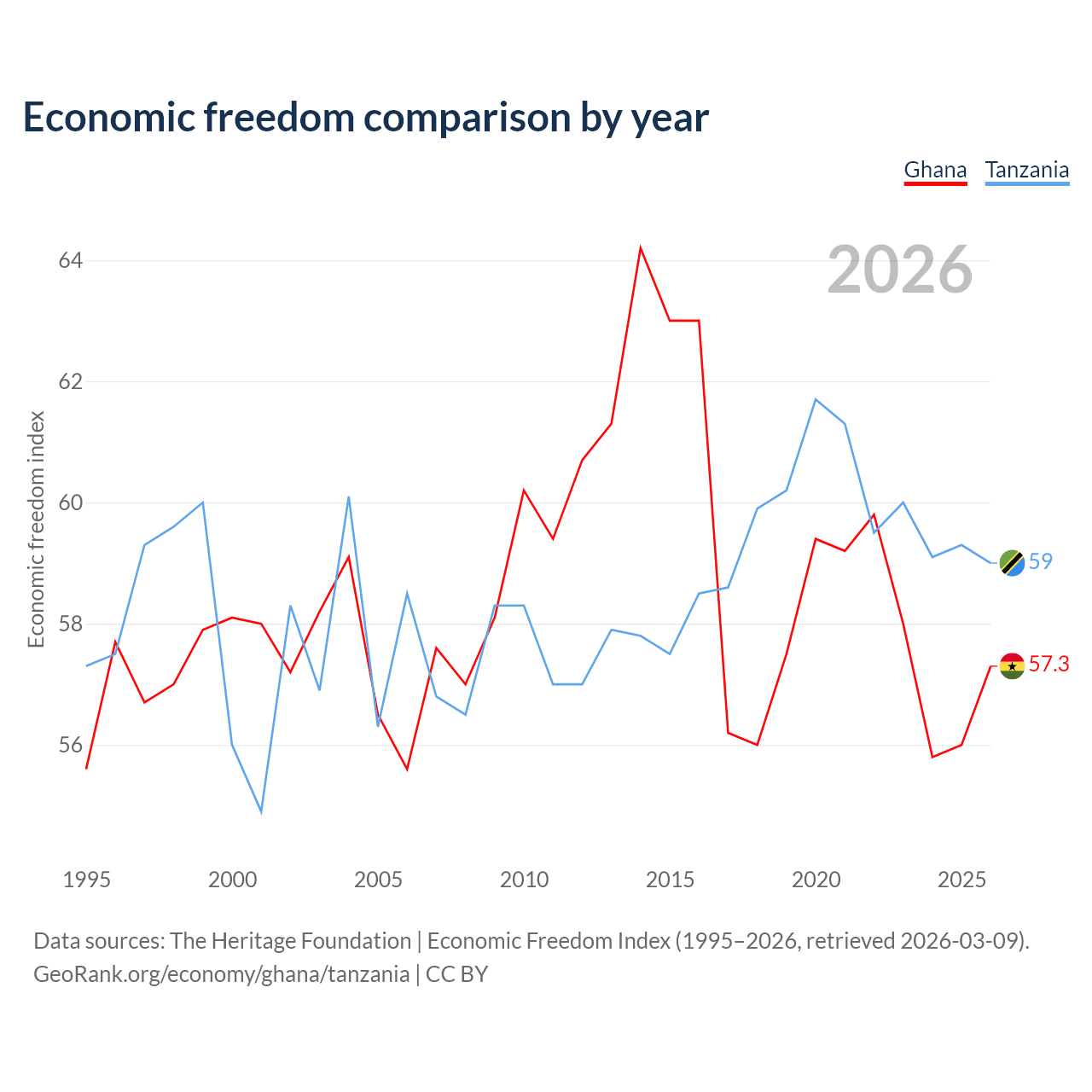 The Economic Freedom Index for Ghana is 57.3, ranking 118/197, compared to 59 for Tanzania, ranking 106/197. The chart above displays a comparison of annual changes in economic freedom indexes.