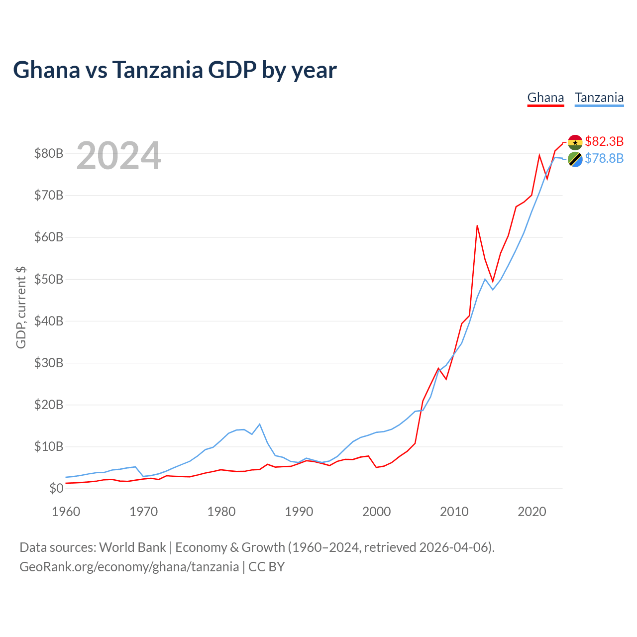 Ghana has a GDP of $82.3B compared to $78.8B for Tanzania, ranking 80/197 and 82/197 by economy size, respectively.