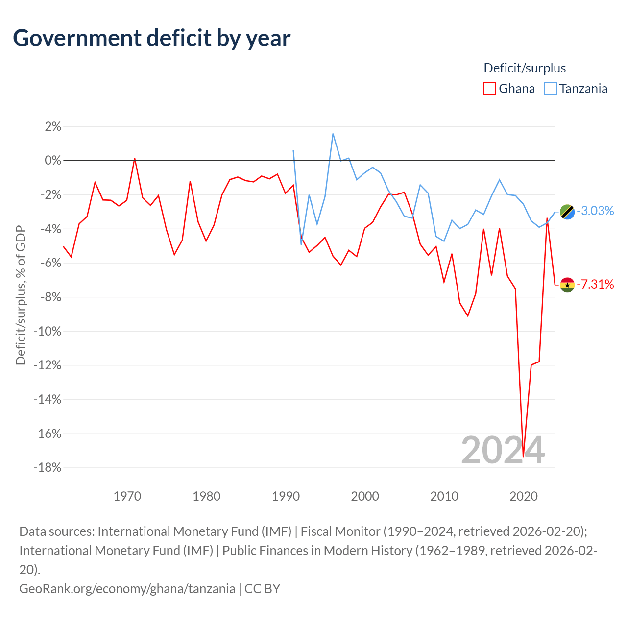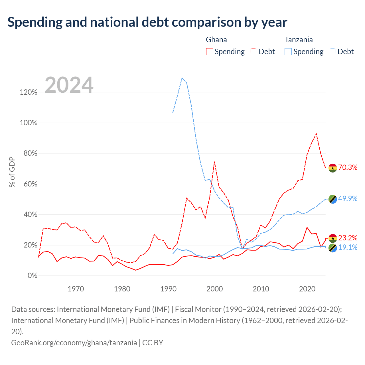 Ghana has $57.9B in government debt (70.3% of GDP), compared to $39.3B (49.9% of GDP) in Tanzania.