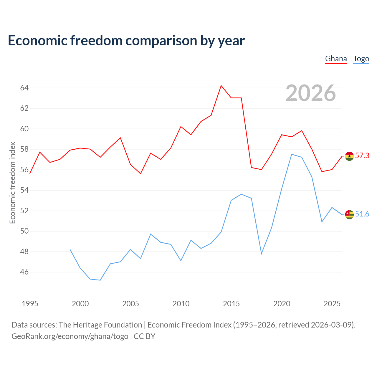 The Economic Freedom Index for Ghana is 57.3, ranking 118/197, compared to 51.6 for Togo, ranking 153/197. The chart above displays a comparison of annual changes in economic freedom indexes.