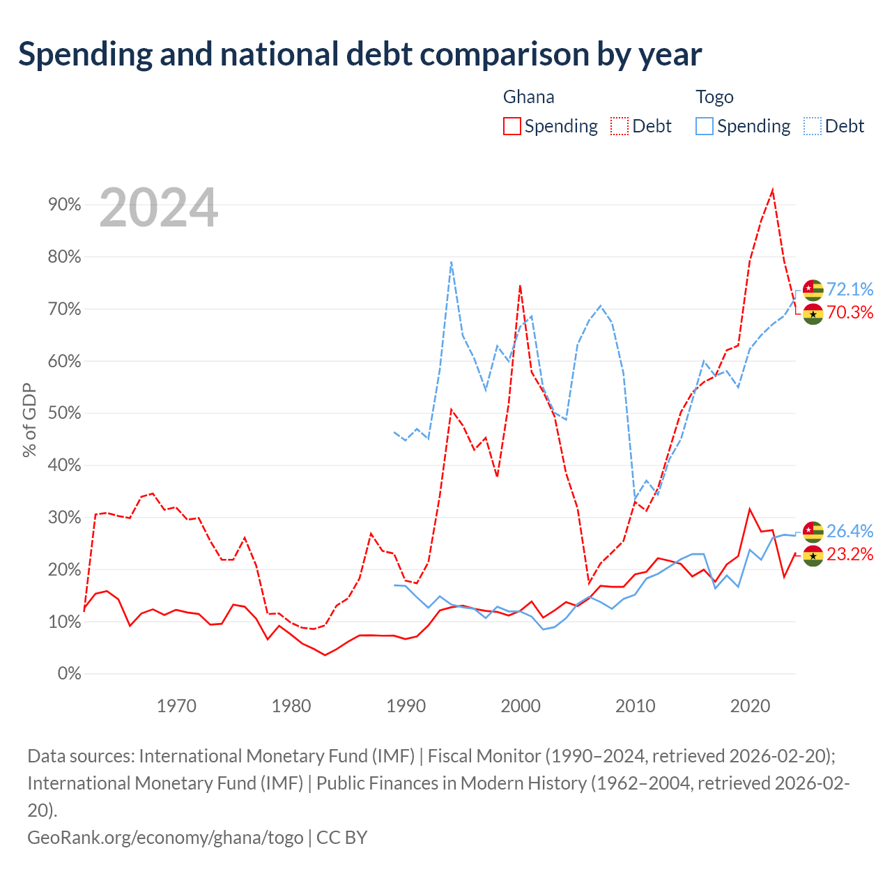 Ghana has $57.9B in government debt (70.3% of GDP), compared to $7.68B (72.1% of GDP) in Togo.