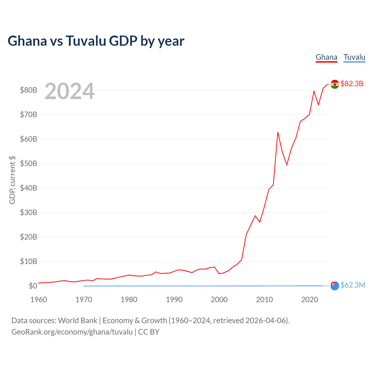 Ghana has a GDP of $82.3B compared to $62.3M for Tuvalu, ranking 80/197 and 196/197 by economy size, respectively.