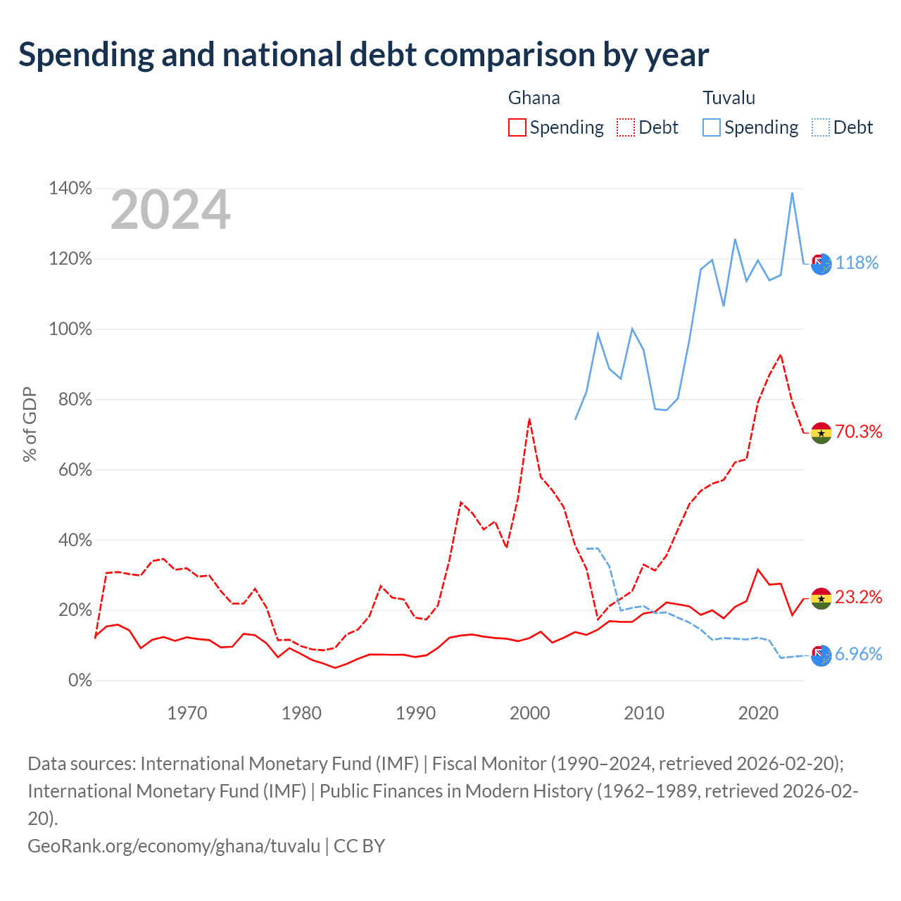 Ghana has $57.9B in government debt (70.3% of GDP), compared to $4.15M (6.96% of GDP) in Tuvalu.
