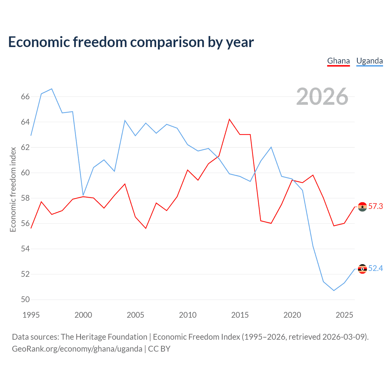 The Economic Freedom Index for Ghana is 57.3, ranking 118/197, compared to 52.4 for Uganda, ranking 149/197. The chart above displays a comparison of annual changes in economic freedom indexes.