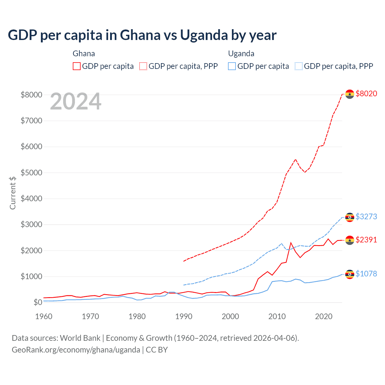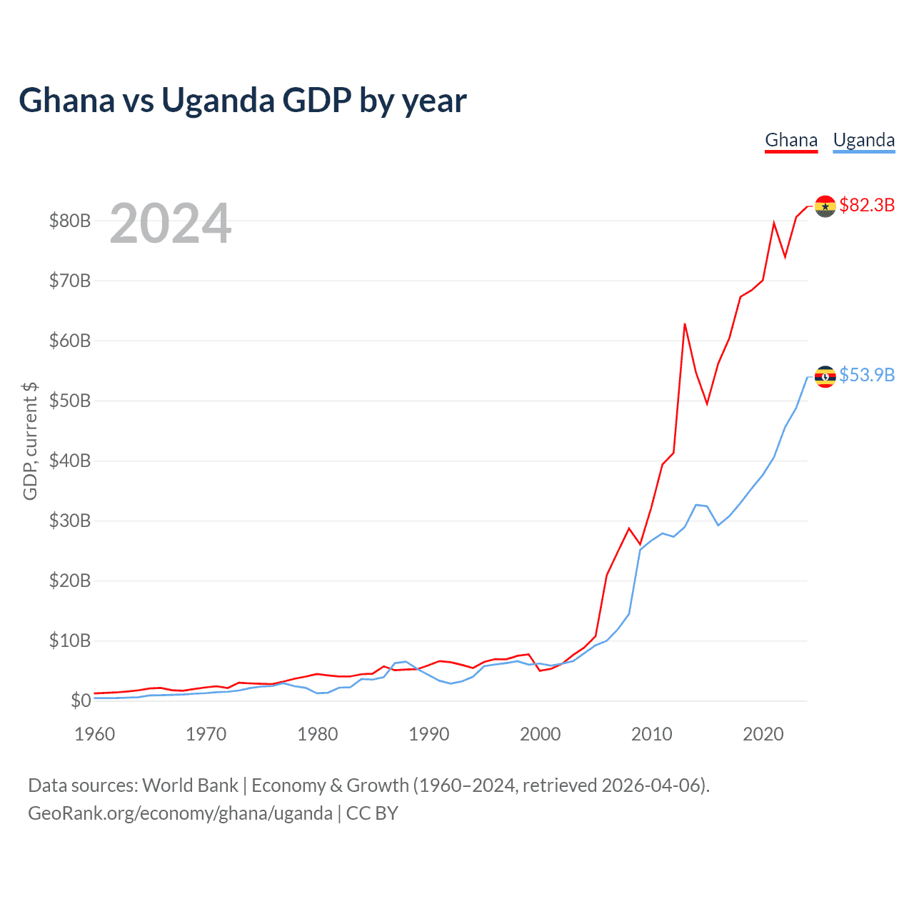 Ghana vs Uganda GDP by year