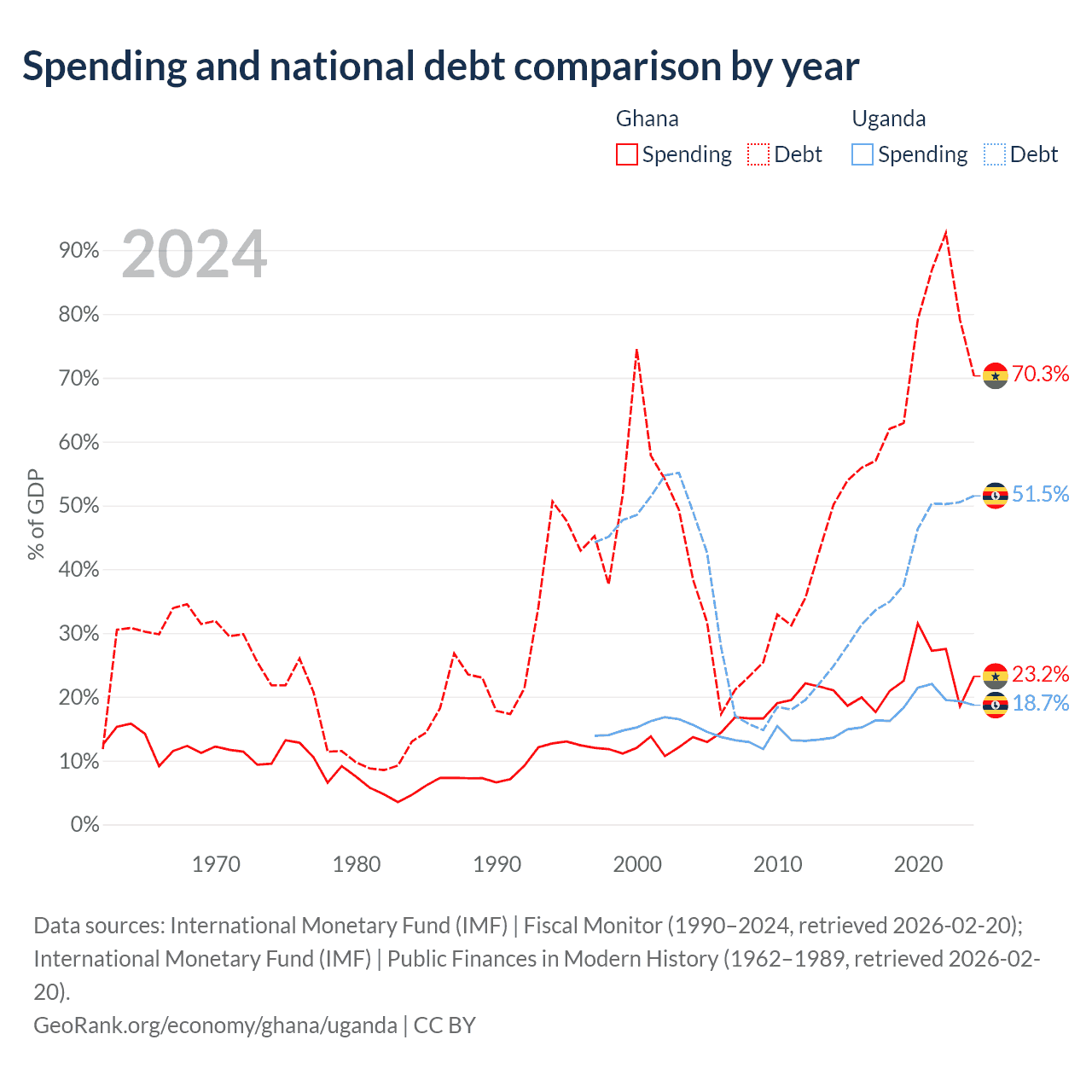 Ghana has $57.9B in government debt (70.3% of GDP), compared to $27.8B (51.5% of GDP) in Uganda.