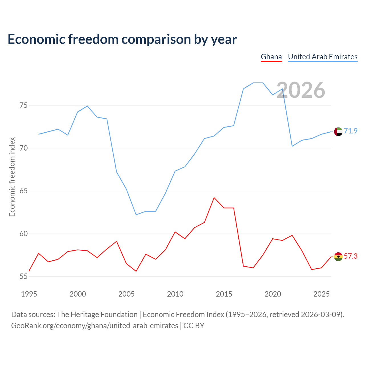 The Economic Freedom Index for Ghana is 57.3, ranking 118/197, compared to 71.9 for the United Arab Emirates, ranking 29/197. The chart above displays a comparison of annual changes in economic freedom indexes.
