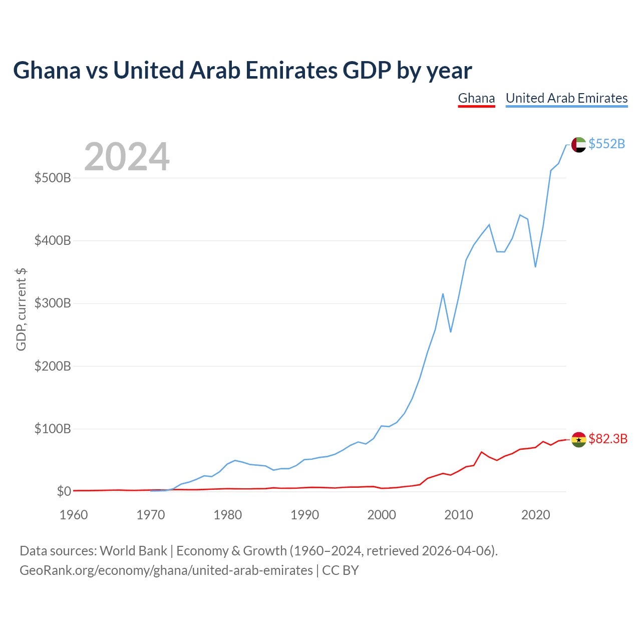 Ghana has a GDP of $82.3B compared to $552B for the United Arab Emirates, ranking 80/197 and 27/197 by economy size, respectively.