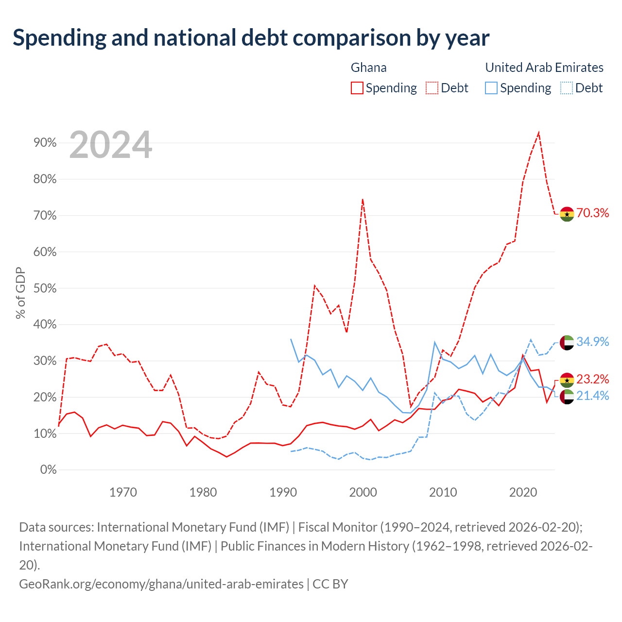 Ghana has $57.9B in government debt (70.3% of GDP), compared to $193B (34.9% of GDP) in the United Arab Emirates.