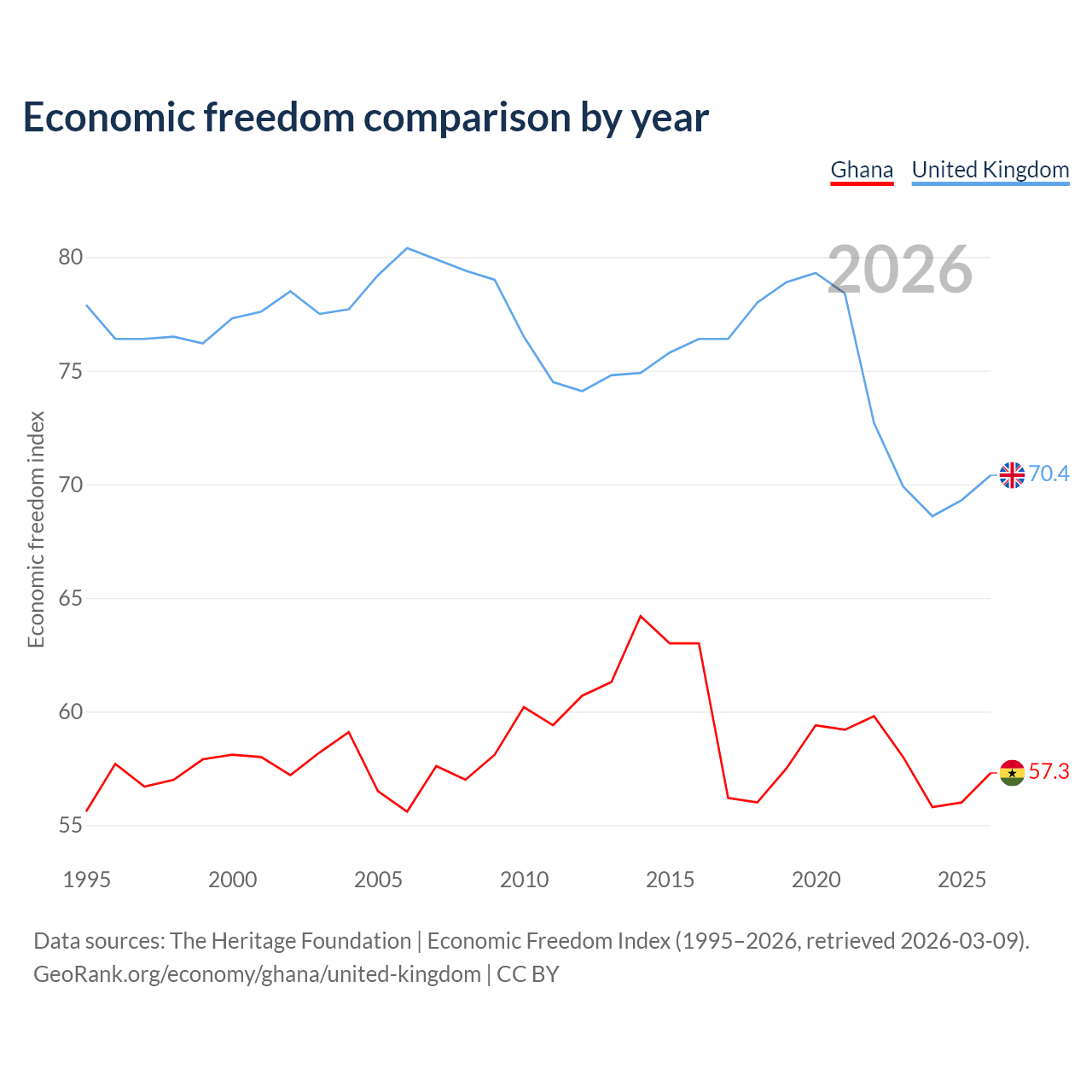 The Economic Freedom Index for Ghana is 57.3, ranking 118/197, compared to 70.4 for the United Kingdom, ranking 35/197. The chart above displays a comparison of annual changes in economic freedom indexes.
