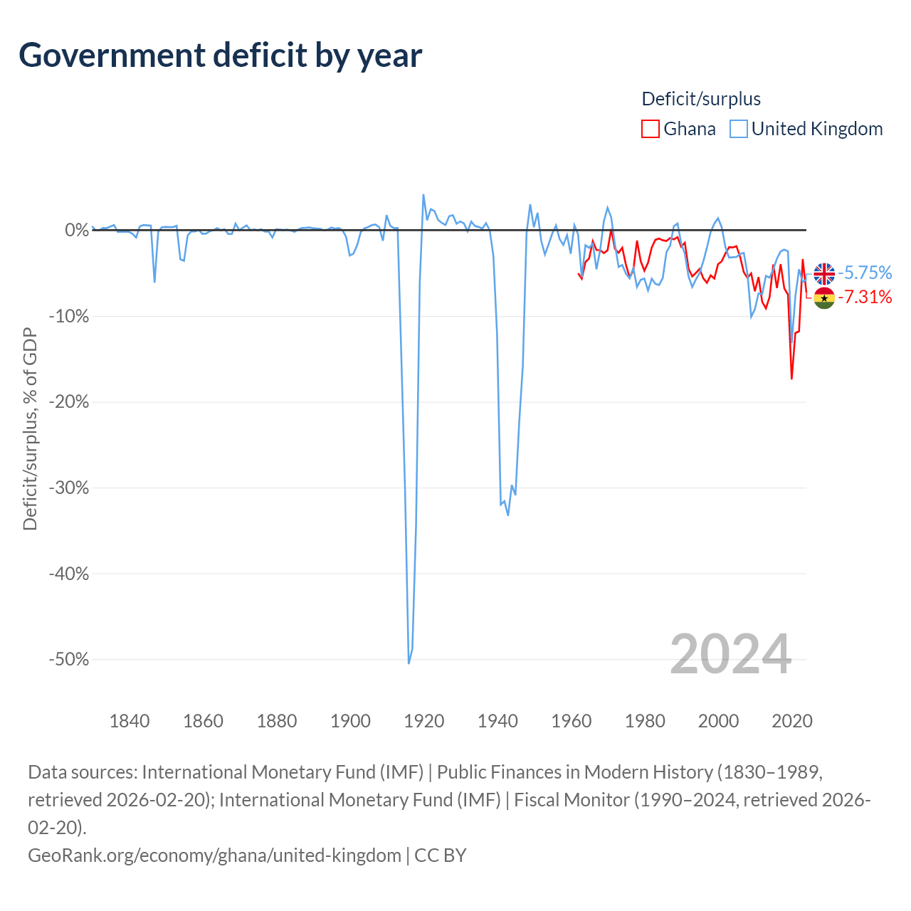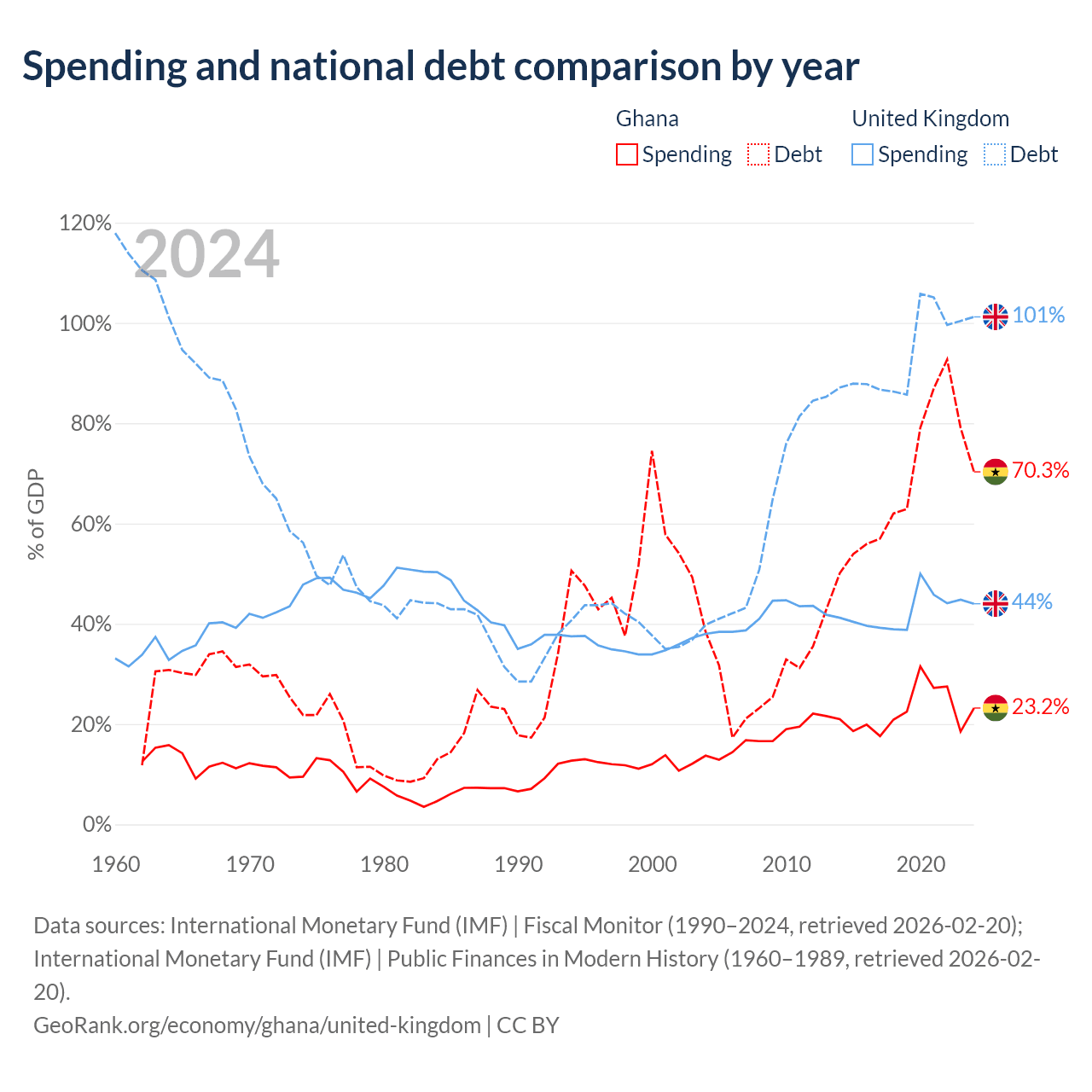 Ghana has $57.9B in government debt (70.3% of GDP), compared to $3.73T (101.2% of GDP) in the United Kingdom.