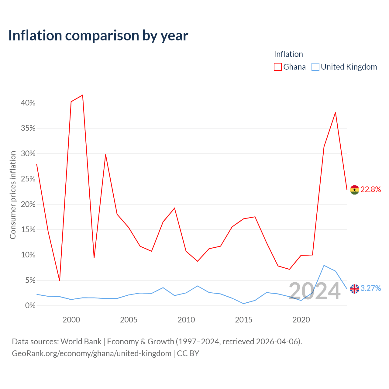 Ghana has a GDP of $82.3B compared to $3.69T for the United Kingdom, ranking 80/197 and 6/197 by economy size, respectively.