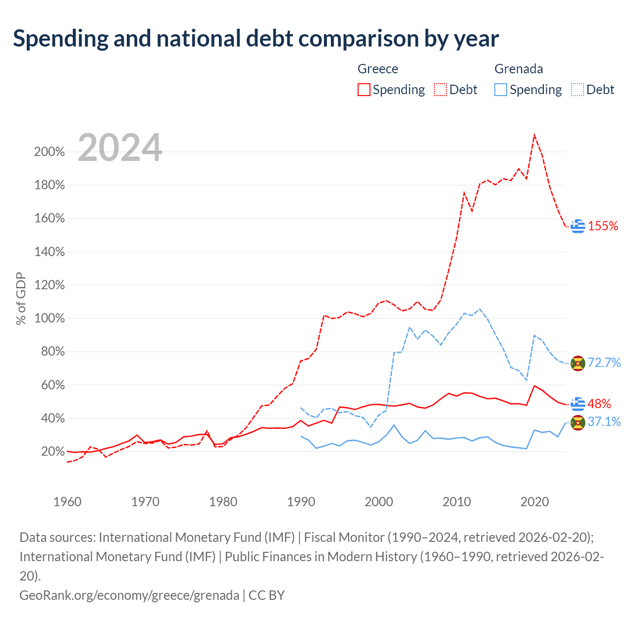 Greece has $397B in government debt (154.8% of GDP), compared to $997M (72.7% of GDP) in Grenada.