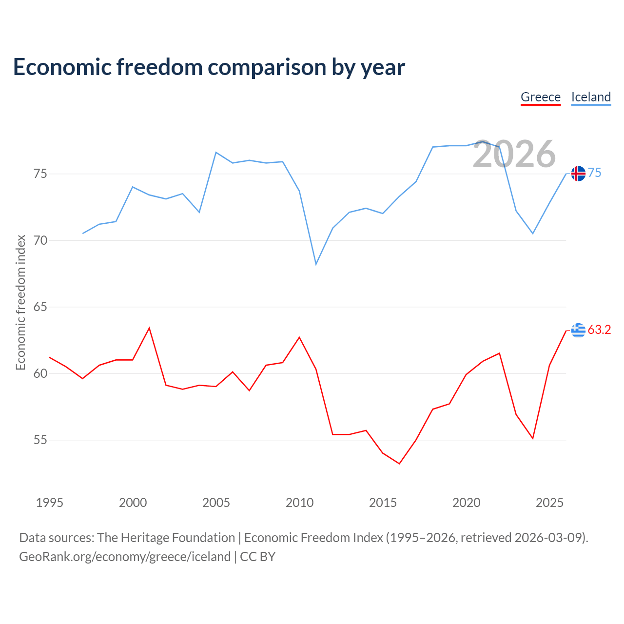 The Economic Freedom Index for Greece is 63.2, ranking 82/197, compared to 75 for Iceland, ranking 19/197. The chart above displays a comparison of annual changes in economic freedom indexes.