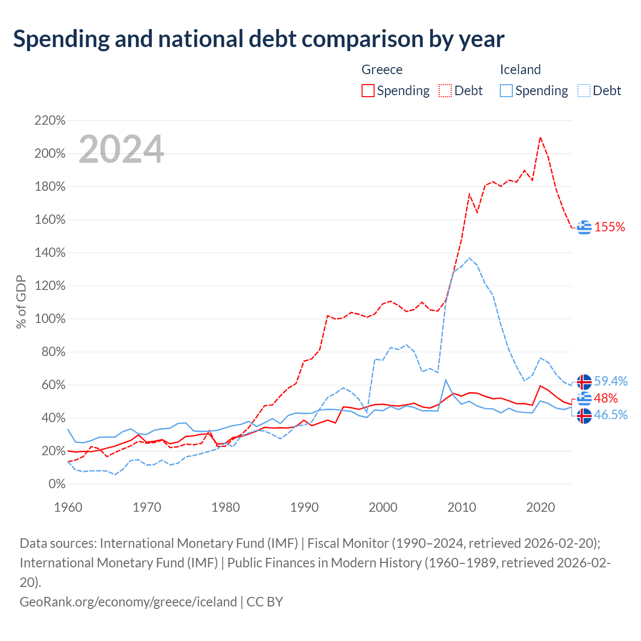 Greece has $397B in government debt (154.8% of GDP), compared to $19.8B (59.4% of GDP) in Iceland.