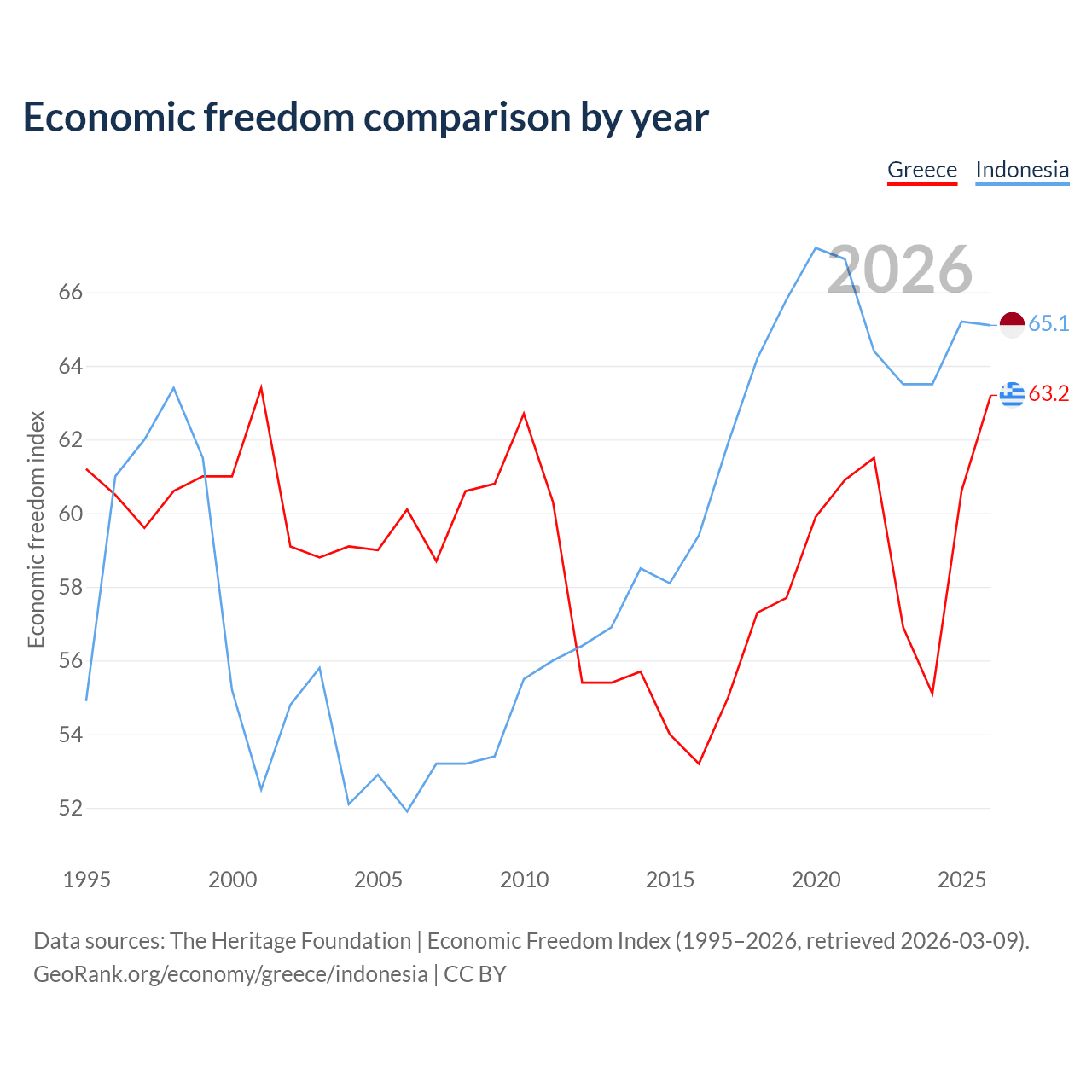 The Economic Freedom Index for Greece is 63.2, ranking 82/197, compared to 65.1 for Indonesia, ranking 67/197. The chart above displays a comparison of annual changes in economic freedom indexes.