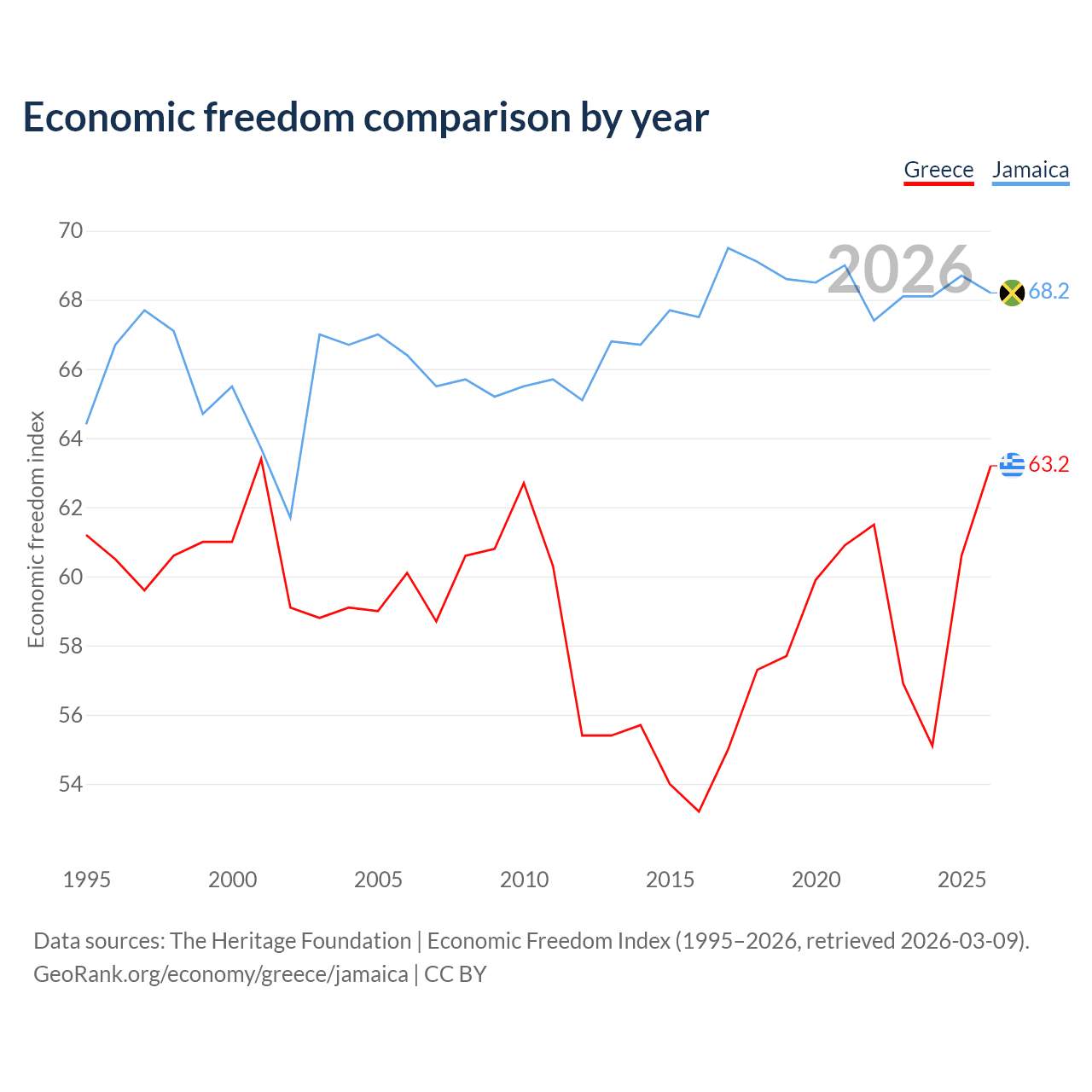 The Economic Freedom Index for Greece is 63.2, ranking 82/197, compared to 68.2 for Jamaica, ranking 48/197. The chart above displays a comparison of annual changes in economic freedom indexes.