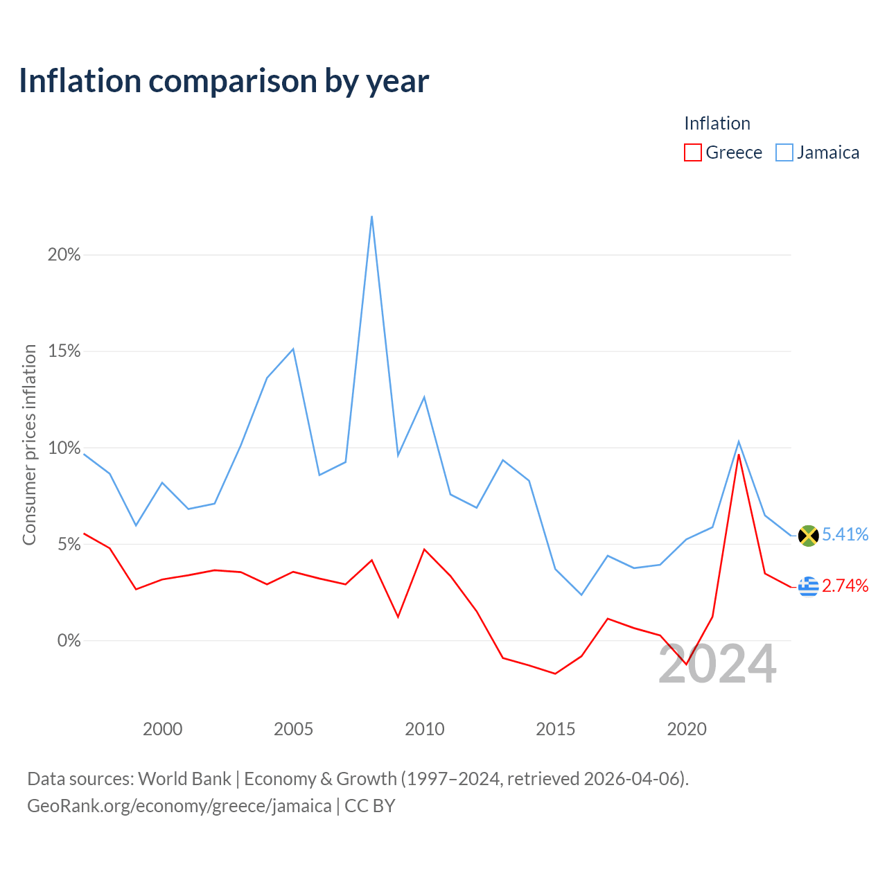 Greece has a GDP of $256B compared to $22B for Jamaica, ranking 53/197 and 124/197 by economy size, respectively.