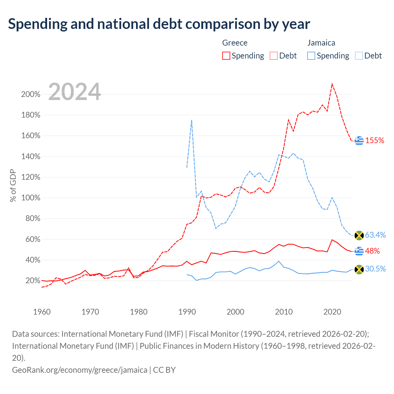 Greece has $397B in government debt (154.8% of GDP), compared to $14B (63.4% of GDP) in Jamaica.