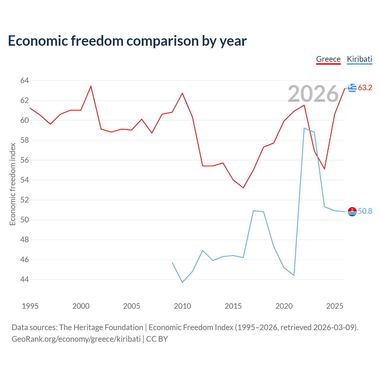 The Economic Freedom Index for Greece is 63.2, ranking 82/197, compared to 50.8 for Kiribati, ranking 158/197. The chart above displays a comparison of annual changes in economic freedom indexes.