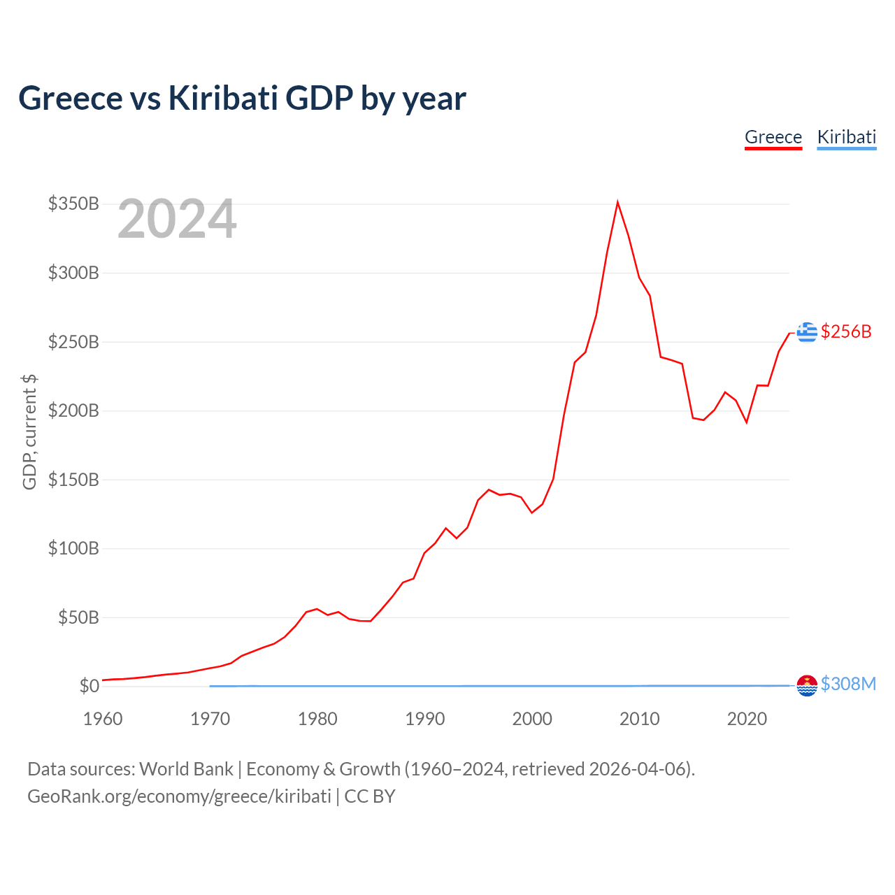 Greece has a GDP of $256B compared to $308M for Kiribati, ranking 53/197 and 192/197 by economy size, respectively.
