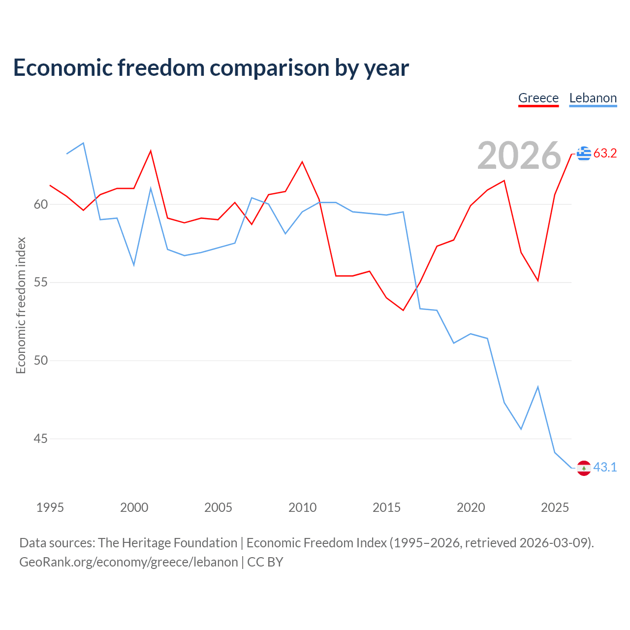 The Economic Freedom Index for Greece is 63.2, ranking 82/197, compared to 43.1 for Lebanon, ranking 183/197. The chart above displays a comparison of annual changes in economic freedom indexes.