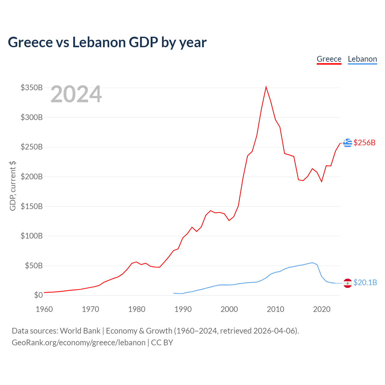 Greece has a GDP of $256B compared to $20.1B for Lebanon, ranking 53/197 and 128/197 by economy size, respectively.