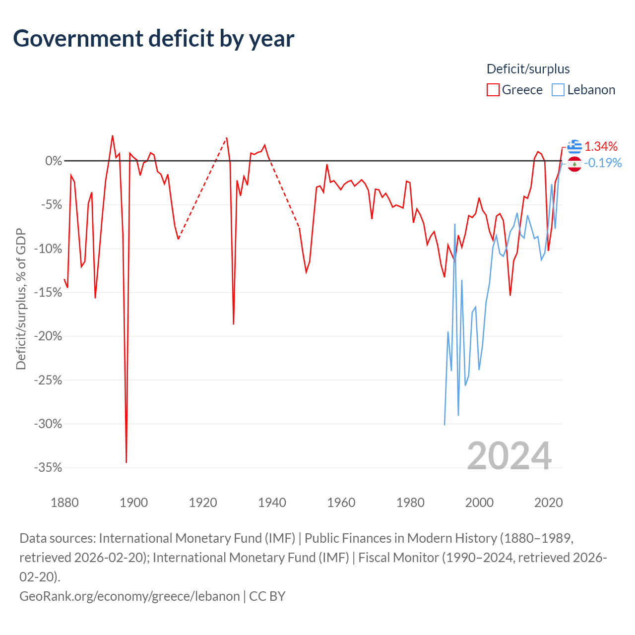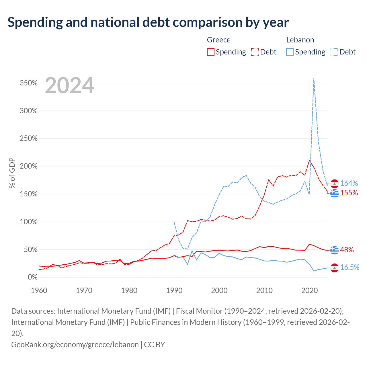 Greece has $397B in government debt (154.8% of GDP), compared to $38.7B (163.8% of GDP) in Lebanon.