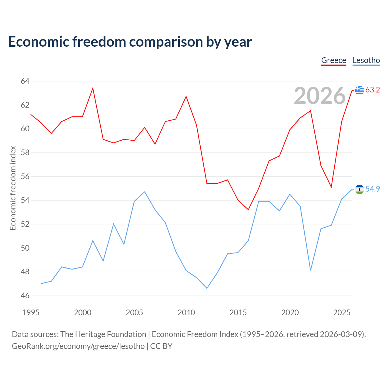 The Economic Freedom Index for Greece is 63.2, ranking 82/197, compared to 54.9 for Lesotho, ranking 130/197. The chart above displays a comparison of annual changes in economic freedom indexes.