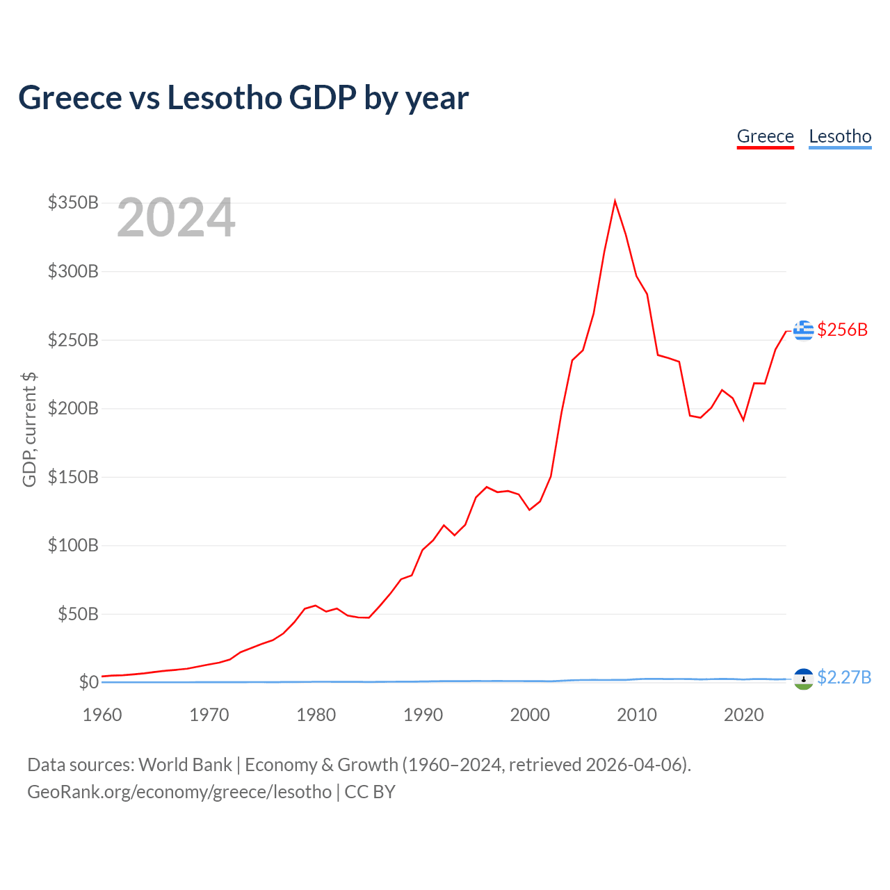 Greece vs Lesotho GDP by year